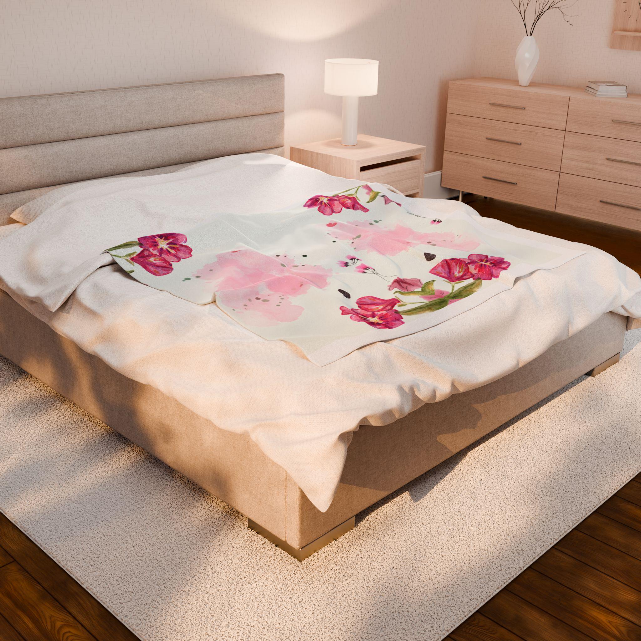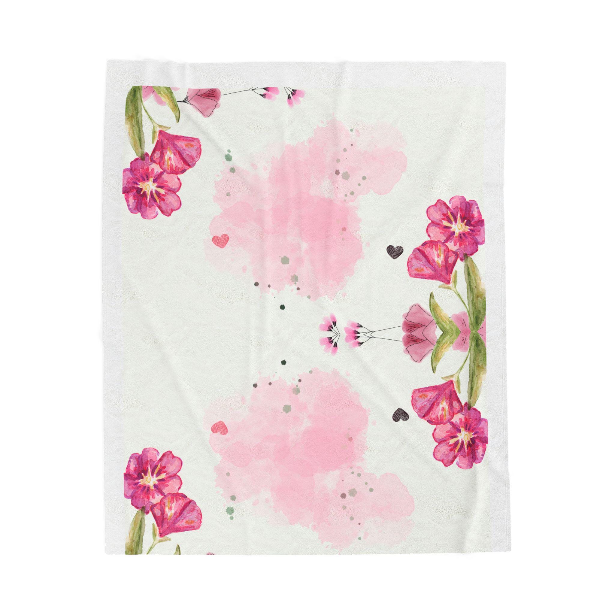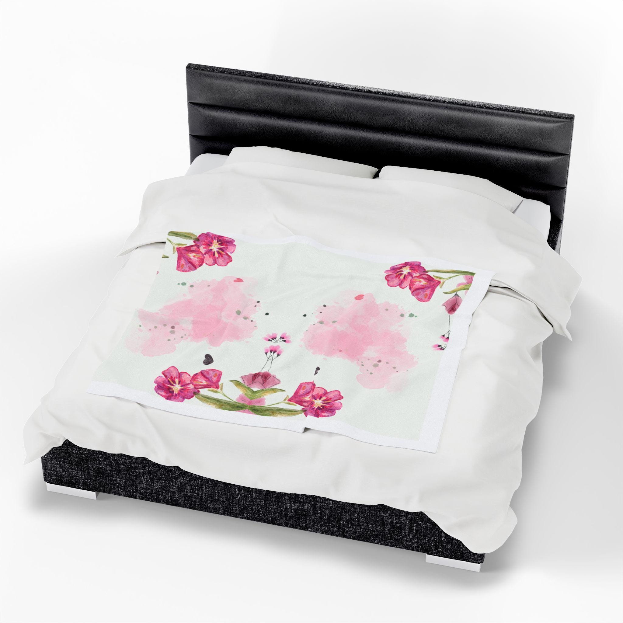A velveteen plush blanket 50"×60" painted in soft-watercolor pinks and botanical accents. The design settles like a warm blush across the fabric—delicate floral clusters at the corners and a mirrored splash of rose in the center. It wraps around slow mornings, sunlit reading nooks, and quiet evenings on the couch. Lightweight yet cozy, it feels like a gentle hug without overheating. This blanket brings a subtle, feminine touch to a bedroom or living space and layers easily with neutral bedding or wicker furnishings for a calm, collected look.