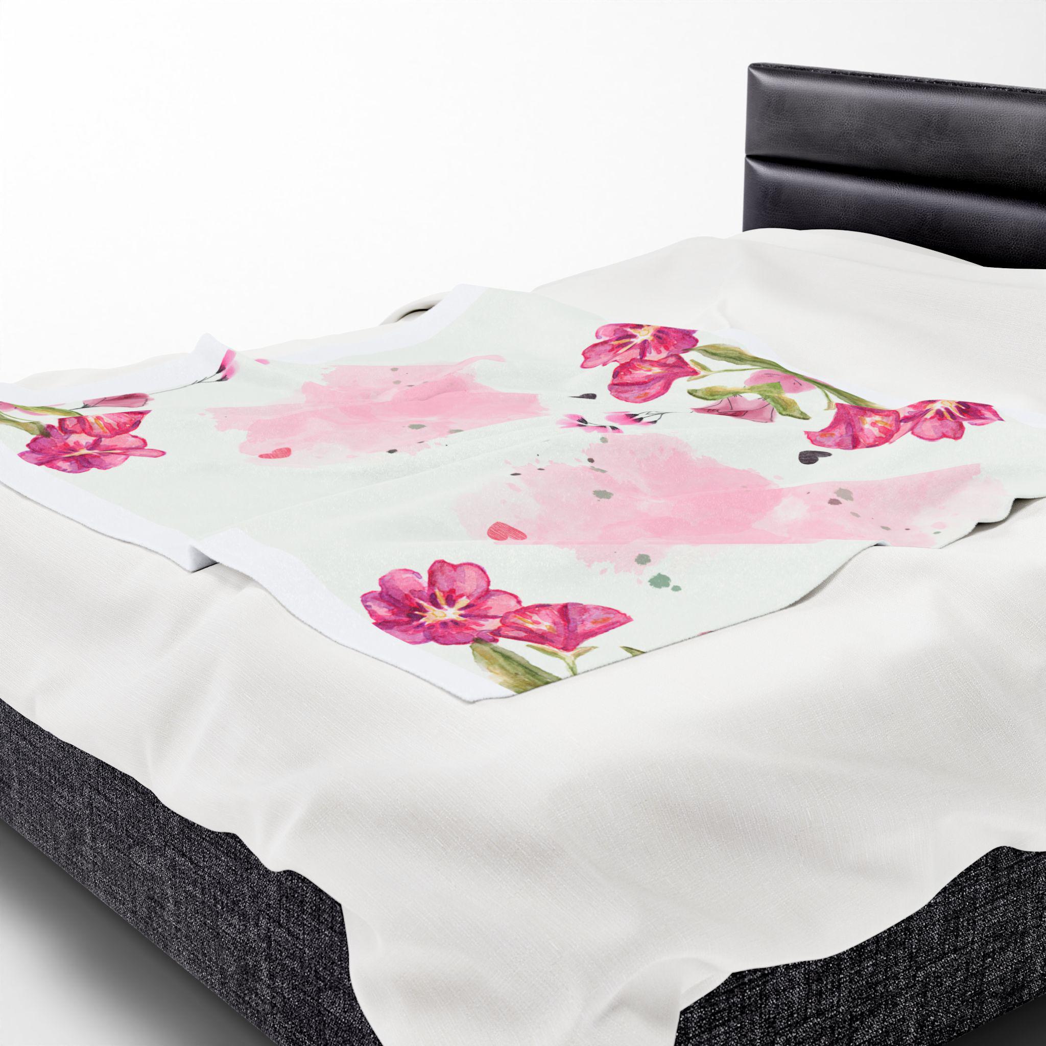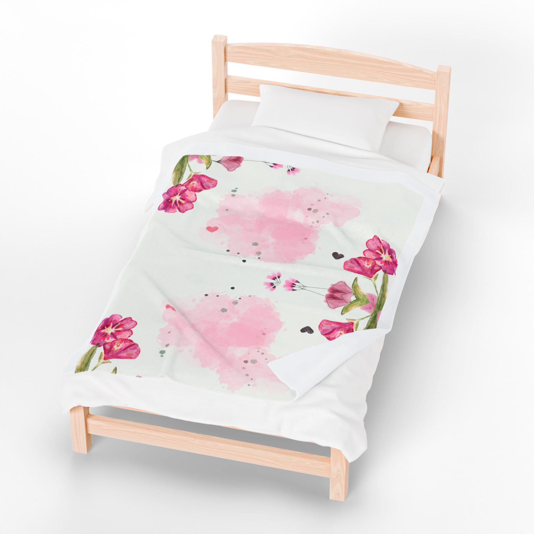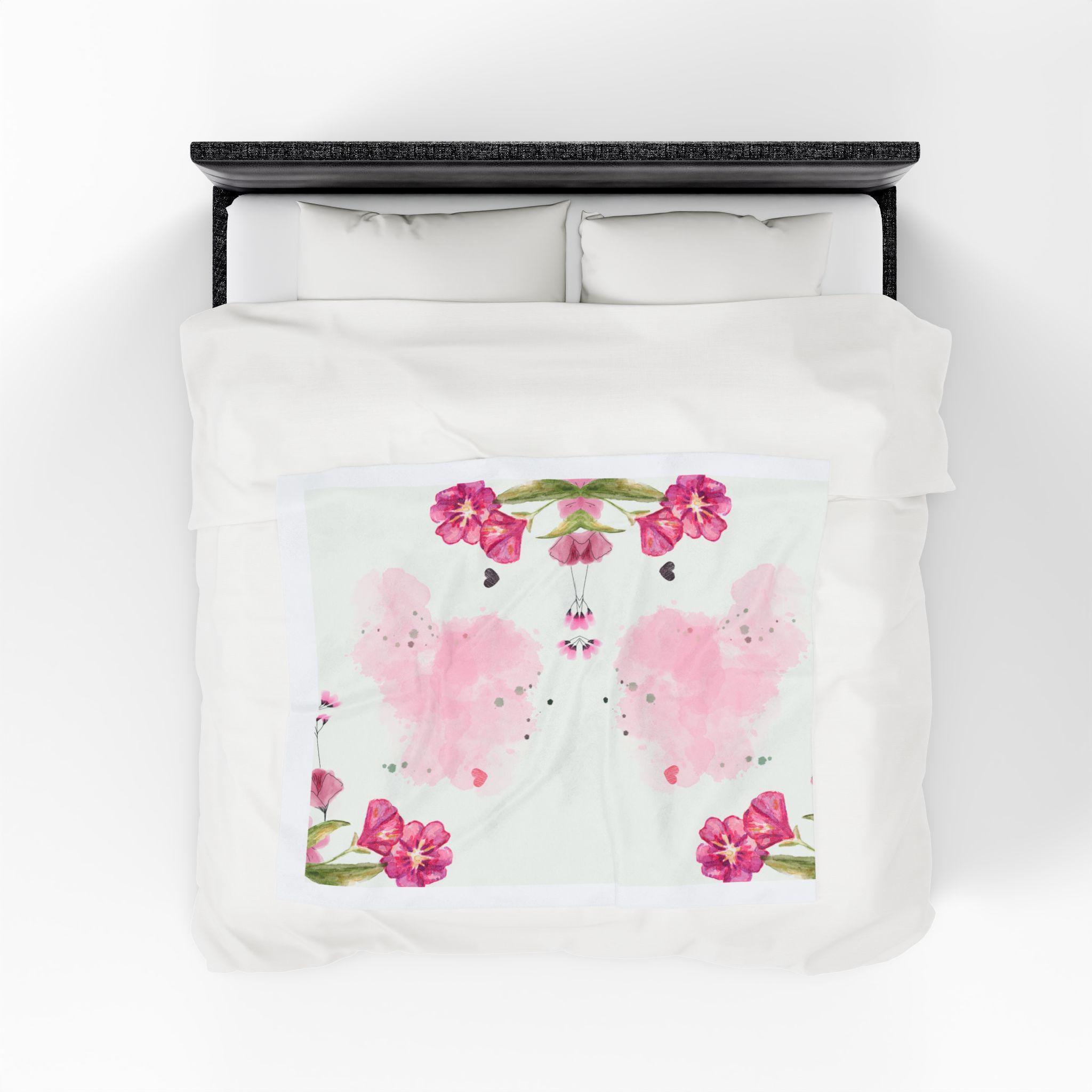 A velveteen plush blanket 50"×60" painted in soft-watercolor pinks and botanical accents. The design settles like a warm blush across the fabric—delicate floral clusters at the corners and a mirrored splash of rose in the center. It wraps around slow mornings, sunlit reading nooks, and quiet evenings on the couch. Lightweight yet cozy, it feels like a gentle hug without overheating. This blanket brings a subtle, feminine touch to a bedroom or living space and layers easily with neutral bedding or wicker furnishings for a calm, collected look.
