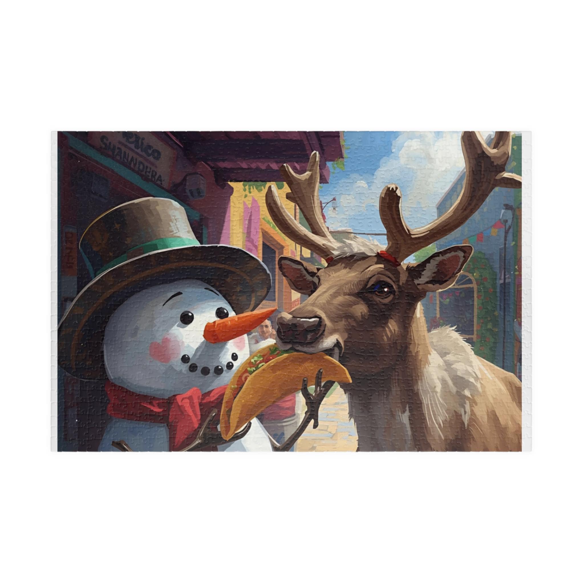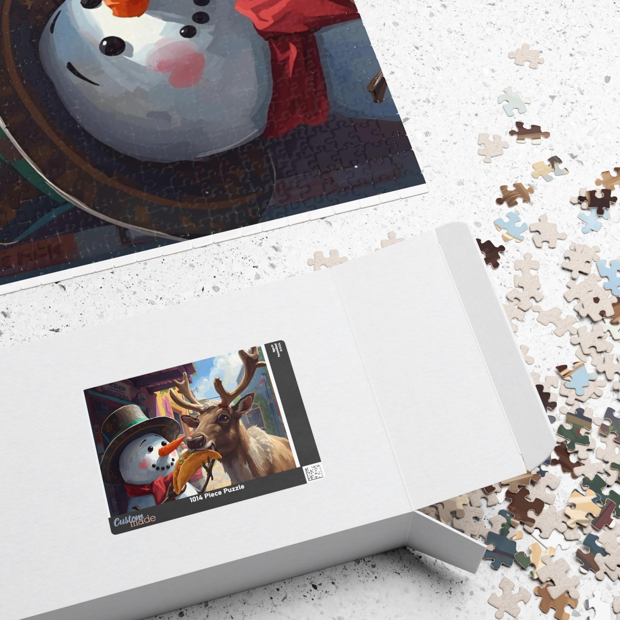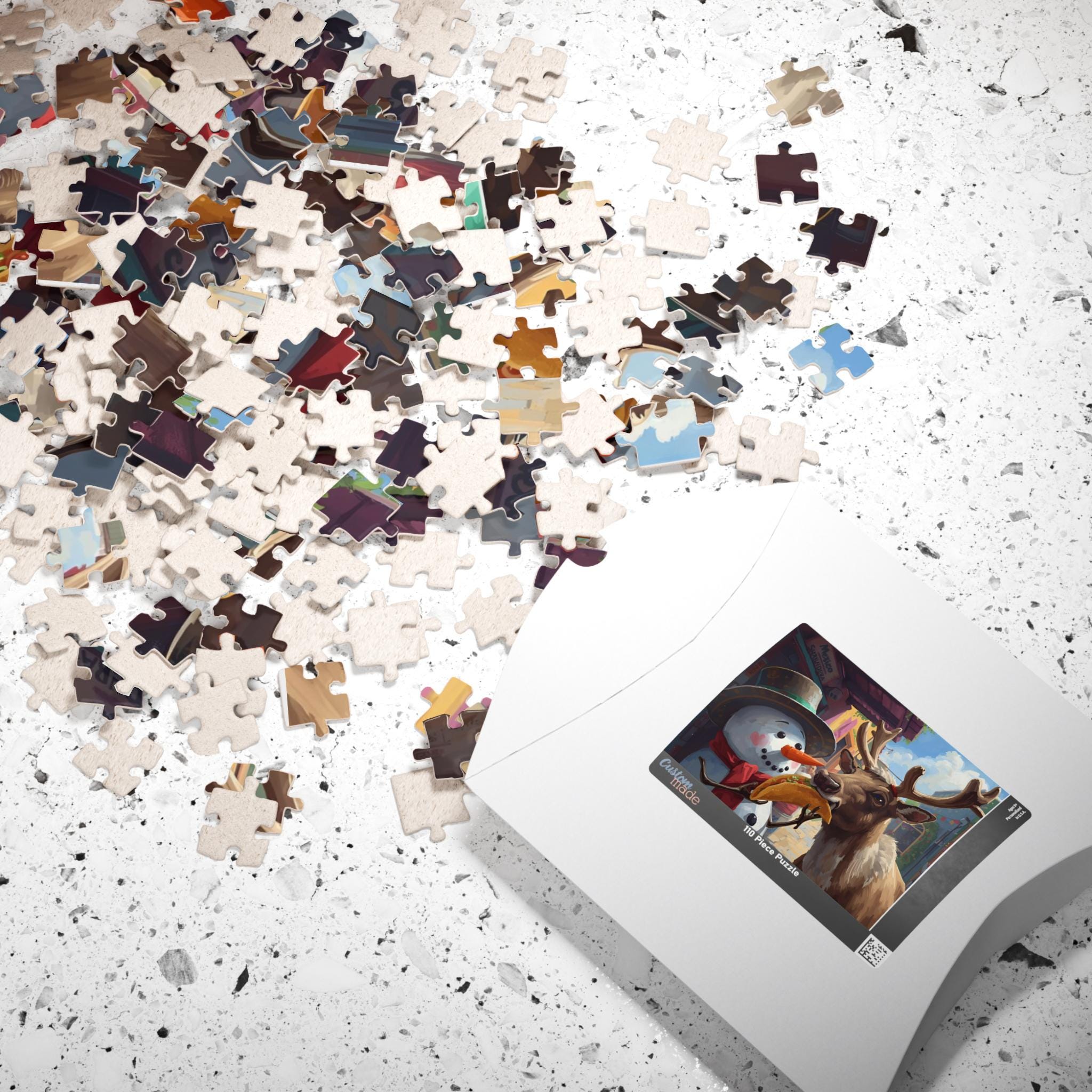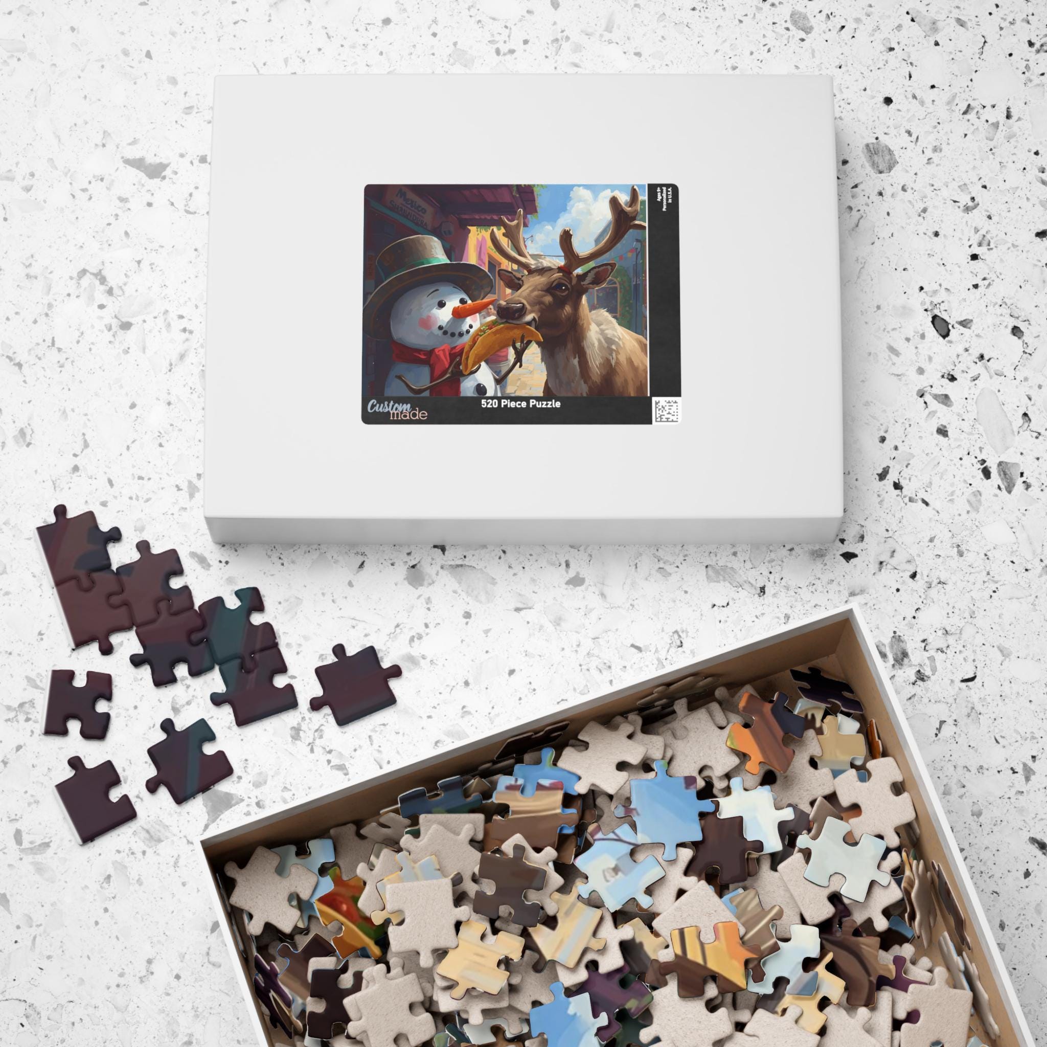 A charming, high-quality jigsaw puzzle that brings a cozy winter scene to life: a friendly reindeer gently sharing a carrot with a smiling snowman in a colorful village lane. Each piece snaps together smoothly from sturdy 100% chipboard and the laminated glossy surface preserves vivid, painterly colors so the illustrated details—from the reindeer’s soft fur to the snowman’s rosy cheeks—pop. Comes with a matching paper box featuring the artwork on top, making storage and gifting simple. Available in four piece counts and vertical or horizontal layouts to suit quiet solo sessions, relaxed family evenings, or lively puzzle nights.
