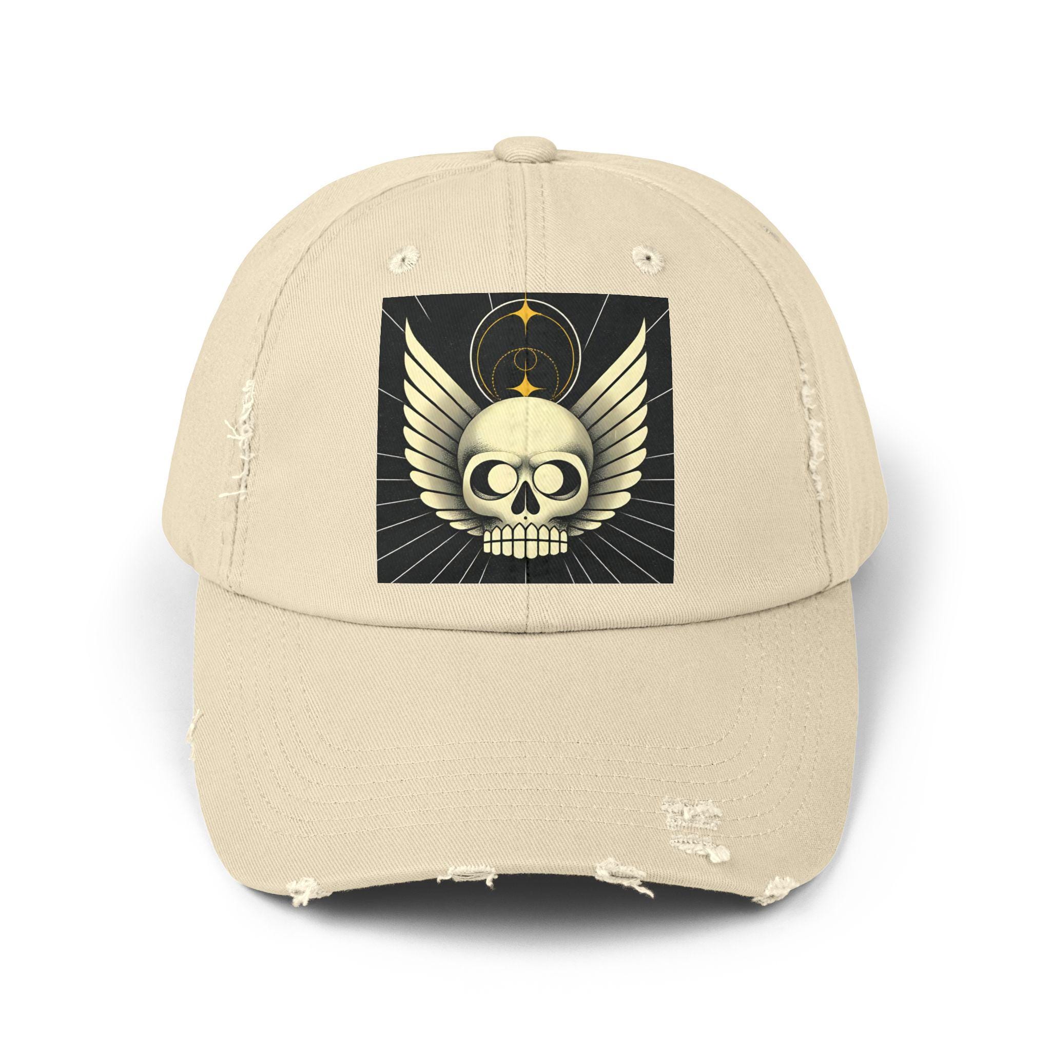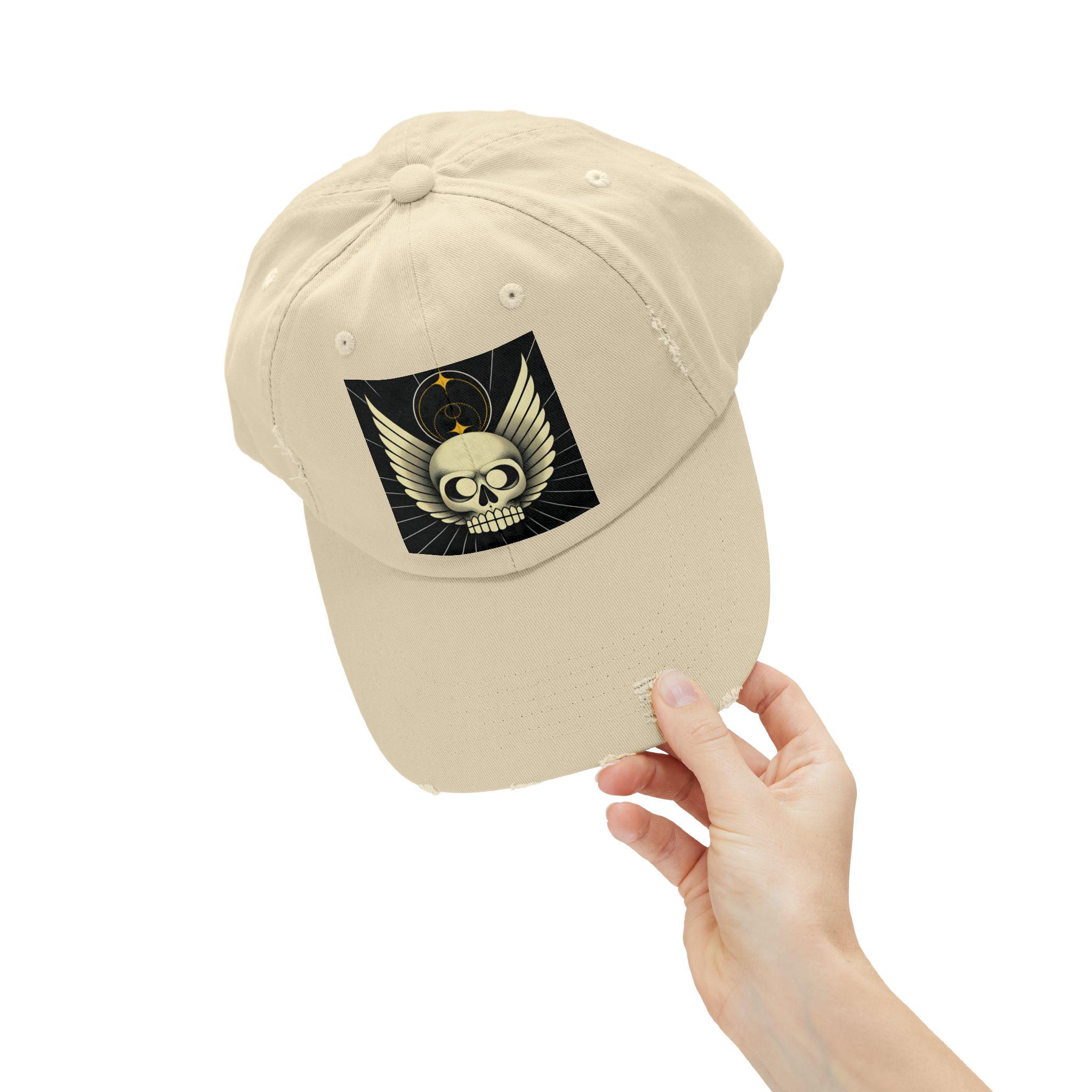 This distressed cap carries a lived-in, road-worn energy. Soft, 100% cotton twill and an unstructured, low-profile build let it settle naturally on your head — the kind of hat that fades into the background while quietly finishing an outfit. The front art shows a winged skull motif with haloed geometry, giving the cap a bold, slightly mysterious edge that reads rock club, vintage biker, or festival night. Scuffs and intentional wear at the brim and panels add personality; no two hats look exactly the same. The hidden fabric strap with a metal D-ring slider lets you fine-tune the fit. Wear it to late-night gigs, motorcycle runs, or when you want to bring a bit of grit to a sunlit street walk.