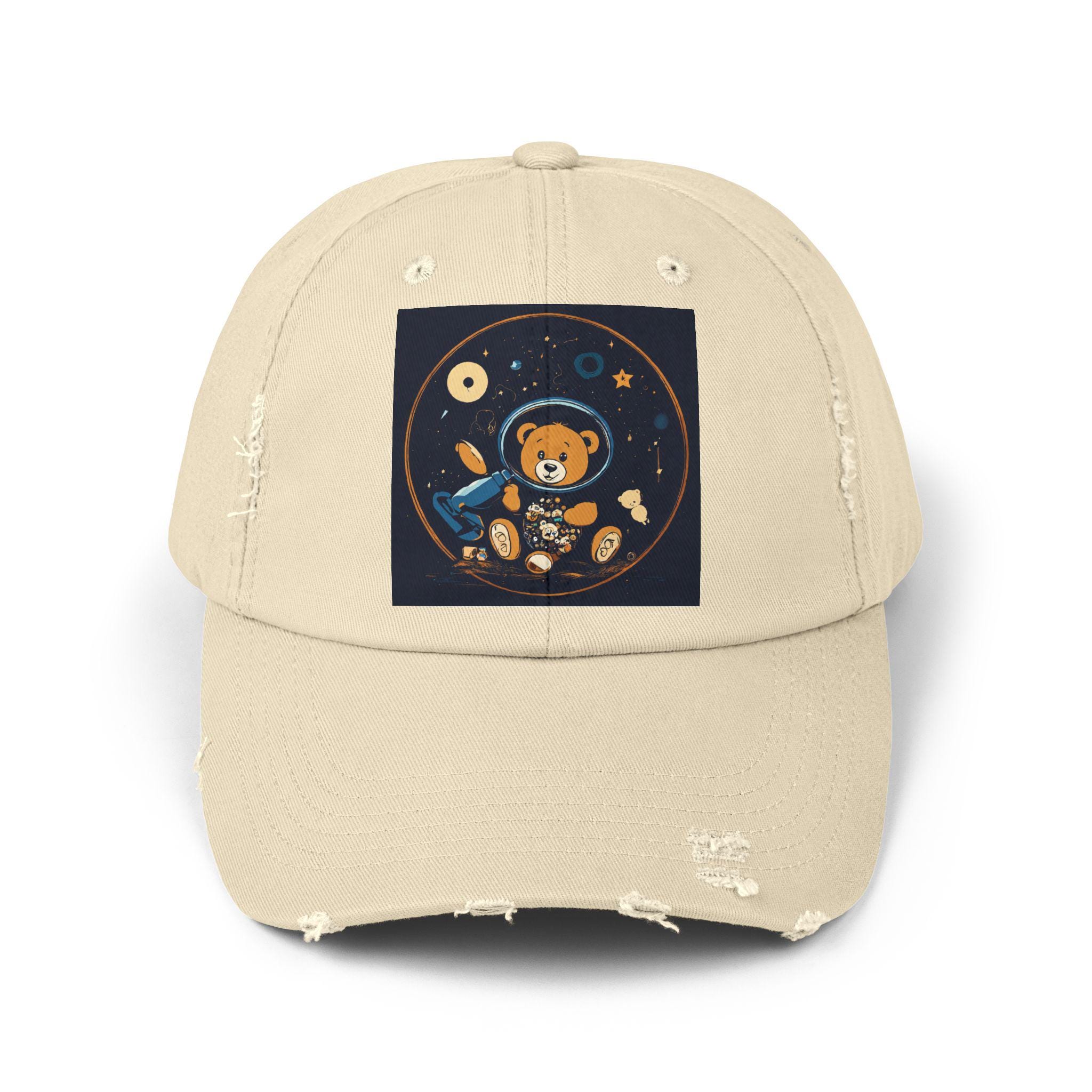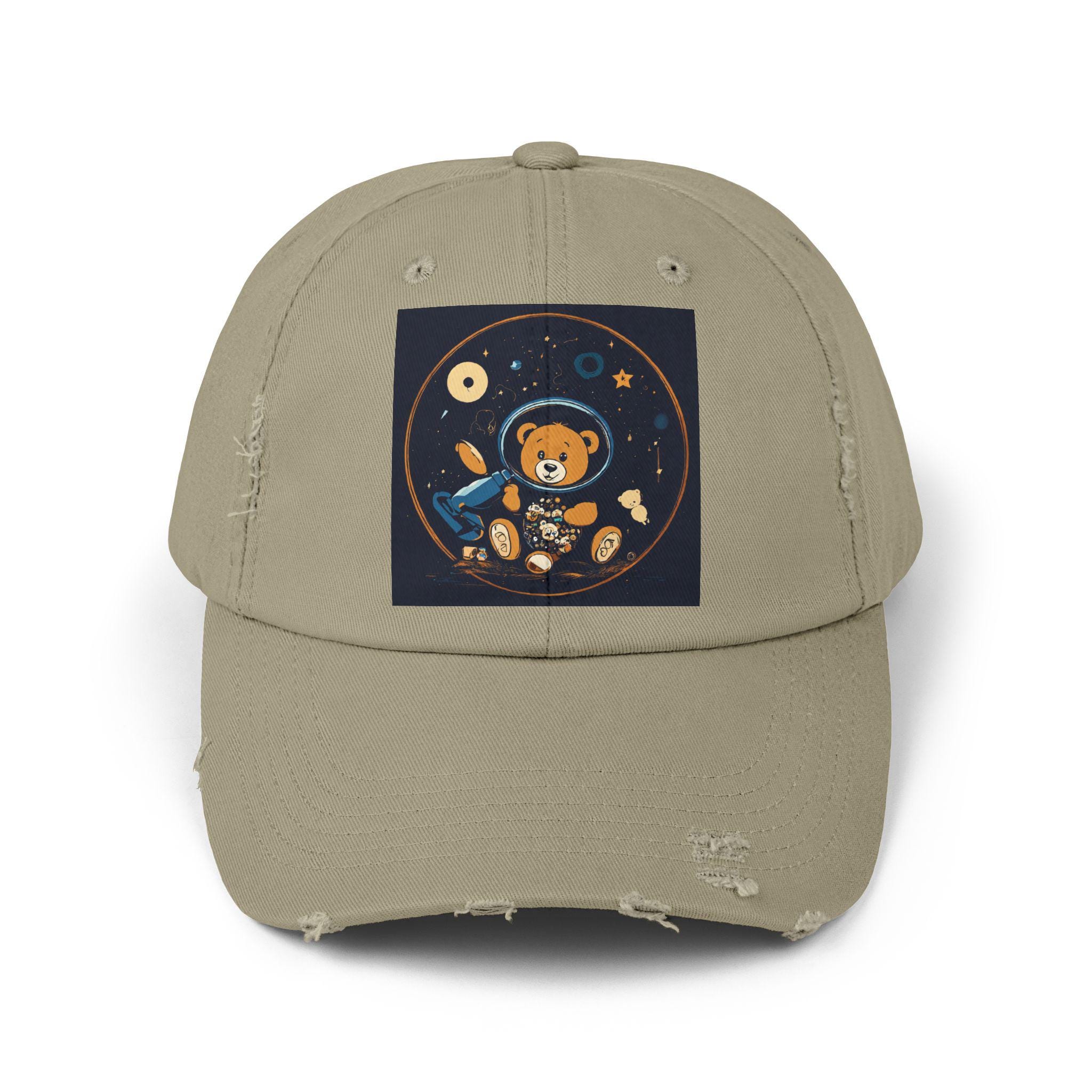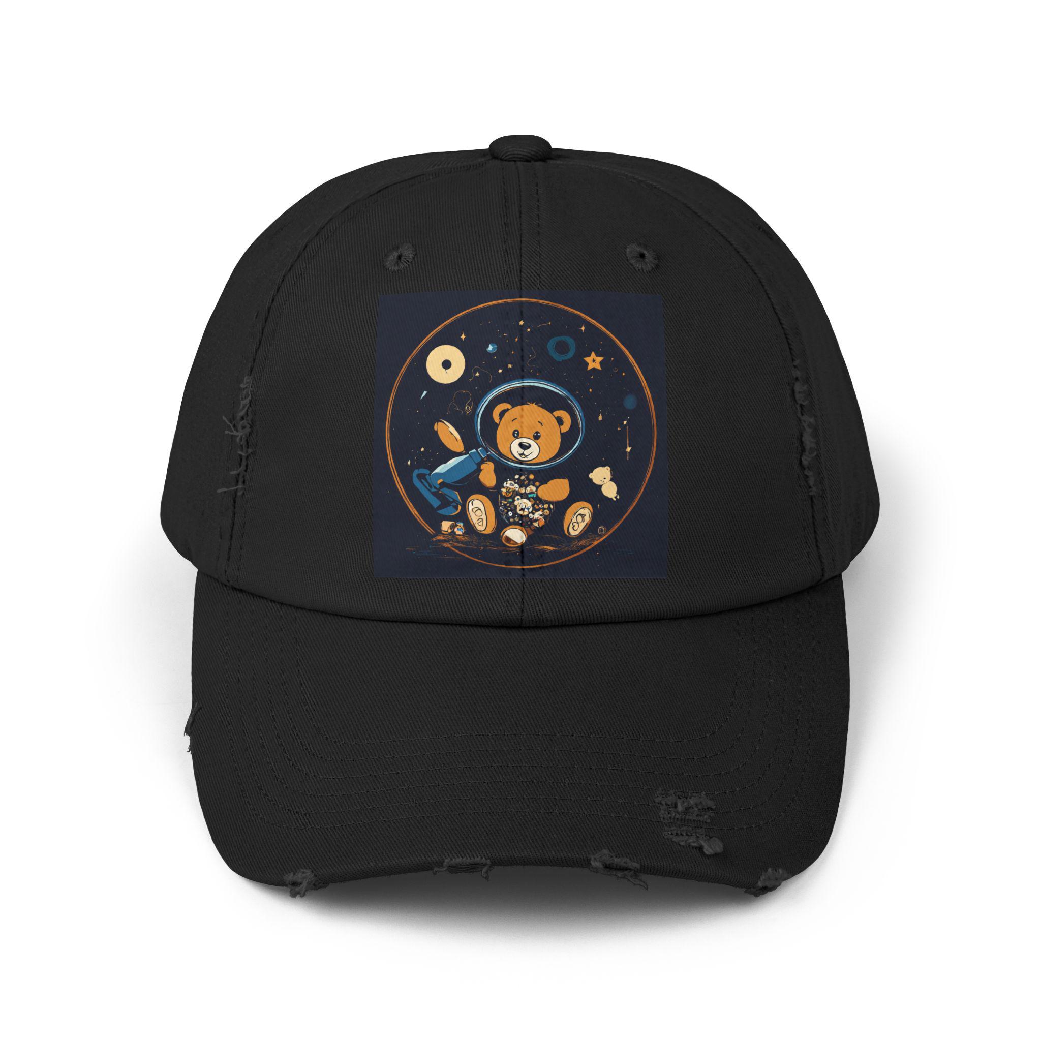 A lived-in, comforting cap that carries a small, whimsical universe. Soft black cotton twill wears in with you — edges soften, colors mellow, and the little astronaut bear print gains personality with every day it’s worn. It settles easily over a messy bun or cropped hair, shading bright afternoons and late-night drives alike. The distressed detailing and low-profile shape give it a relaxed silhouette that reads more like a trusted companion than a brand-new accessory. Slip it on for casual mornings at the coffee shop, park strolls, or to top off an outfit when you want a touch of playful, nostalgic charm.
