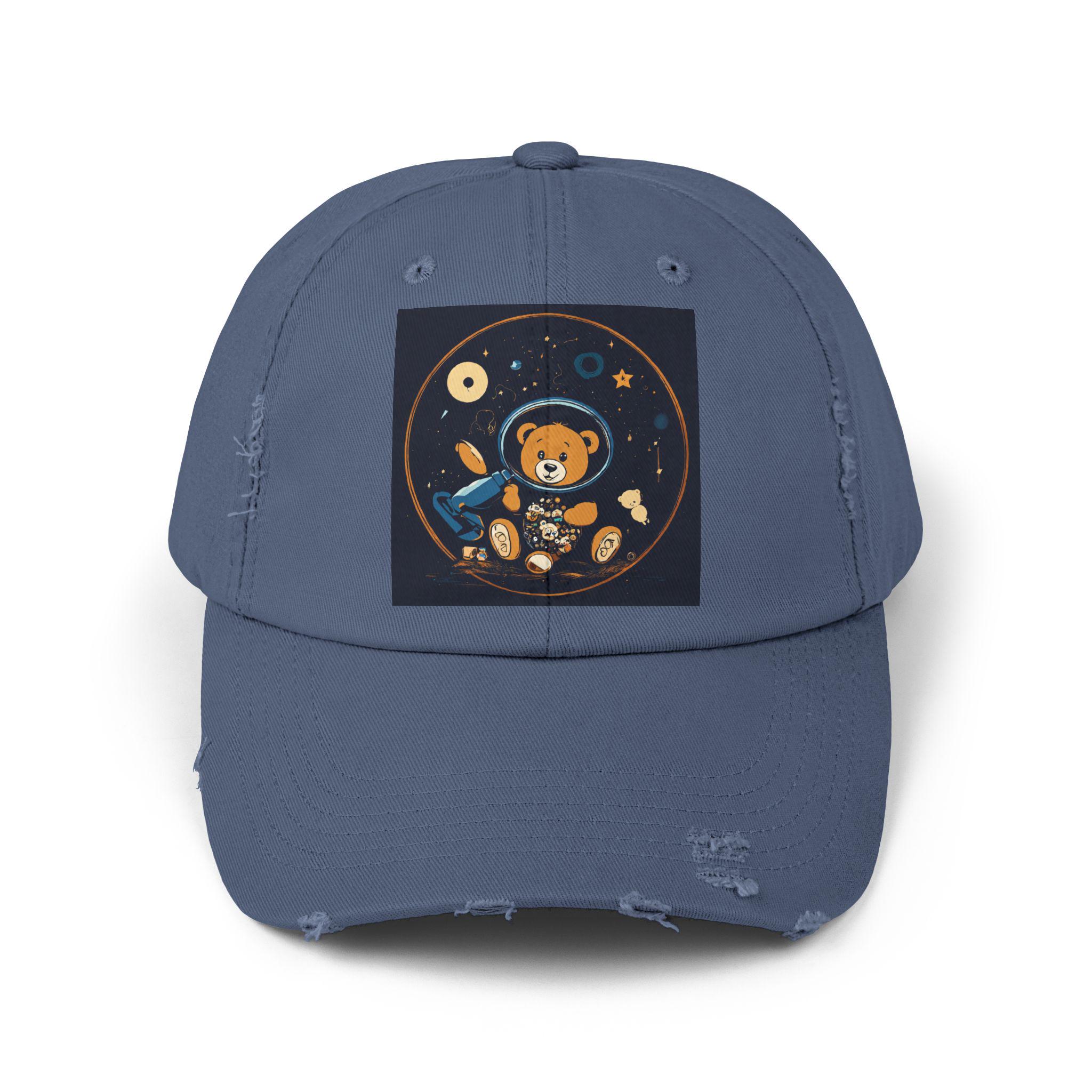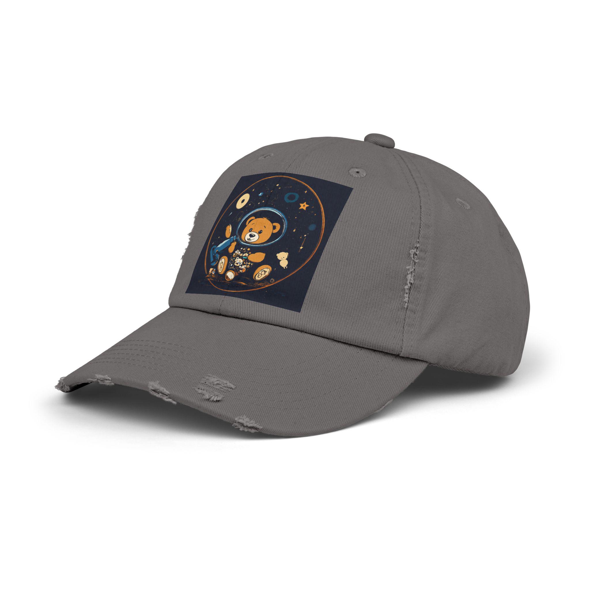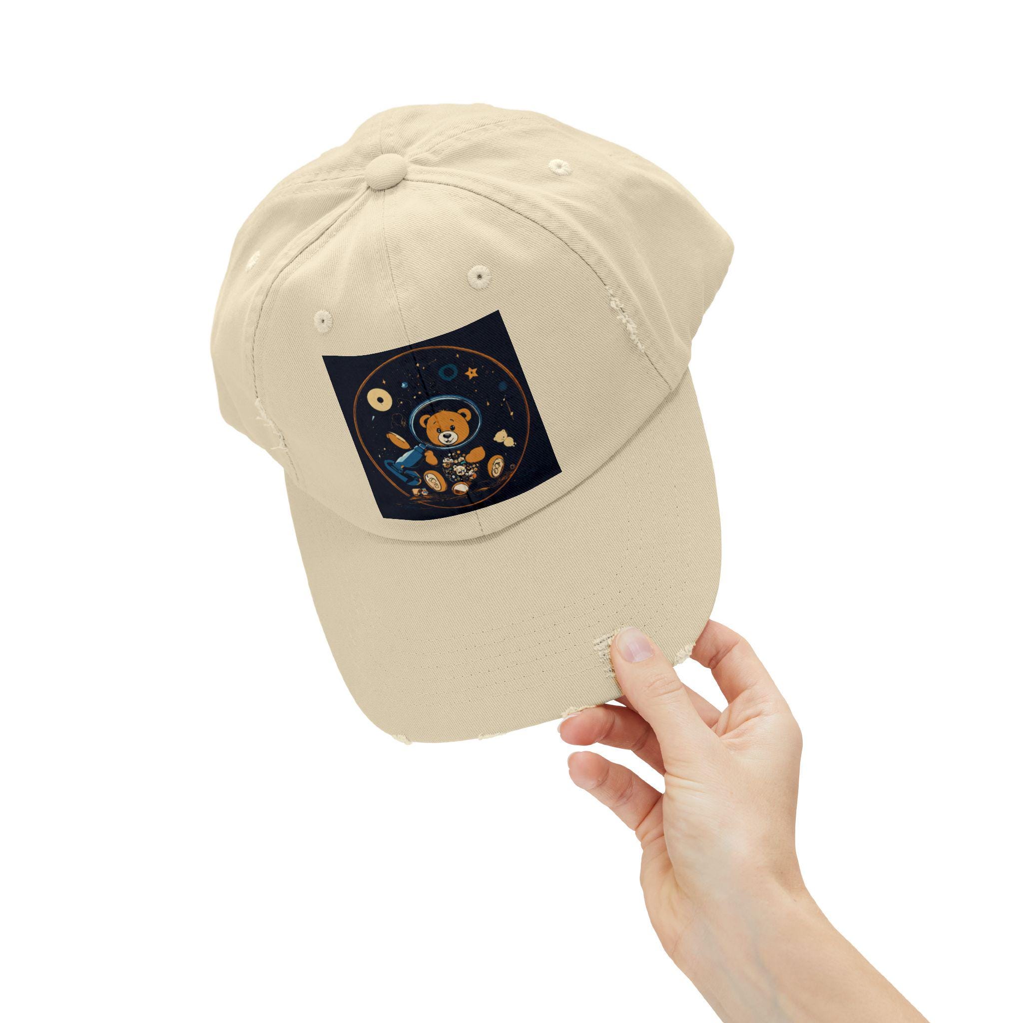 A lived-in, comforting cap that carries a small, whimsical universe. Soft black cotton twill wears in with you — edges soften, colors mellow, and the little astronaut bear print gains personality with every day it’s worn. It settles easily over a messy bun or cropped hair, shading bright afternoons and late-night drives alike. The distressed detailing and low-profile shape give it a relaxed silhouette that reads more like a trusted companion than a brand-new accessory. Slip it on for casual mornings at the coffee shop, park strolls, or to top off an outfit when you want a touch of playful, nostalgic charm.