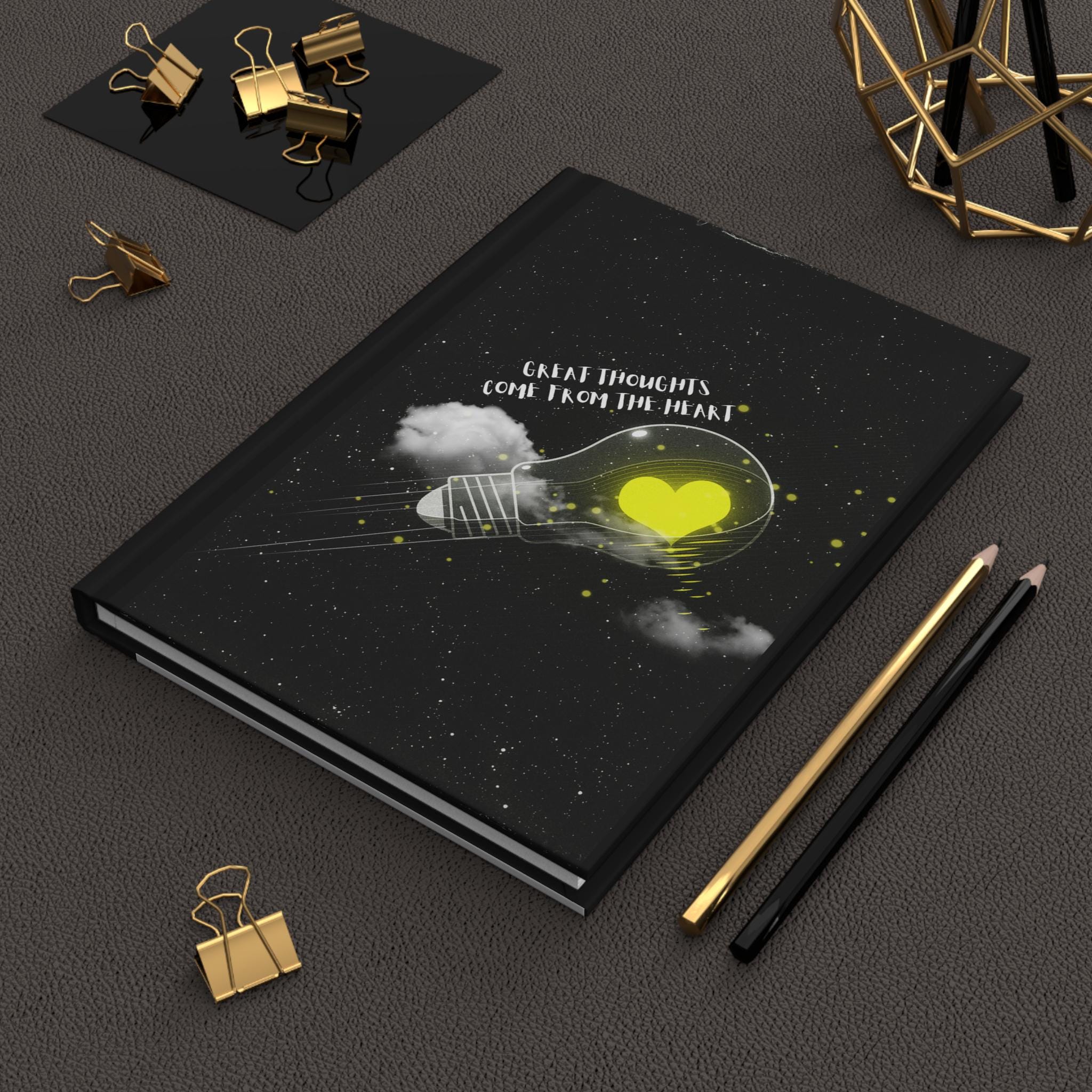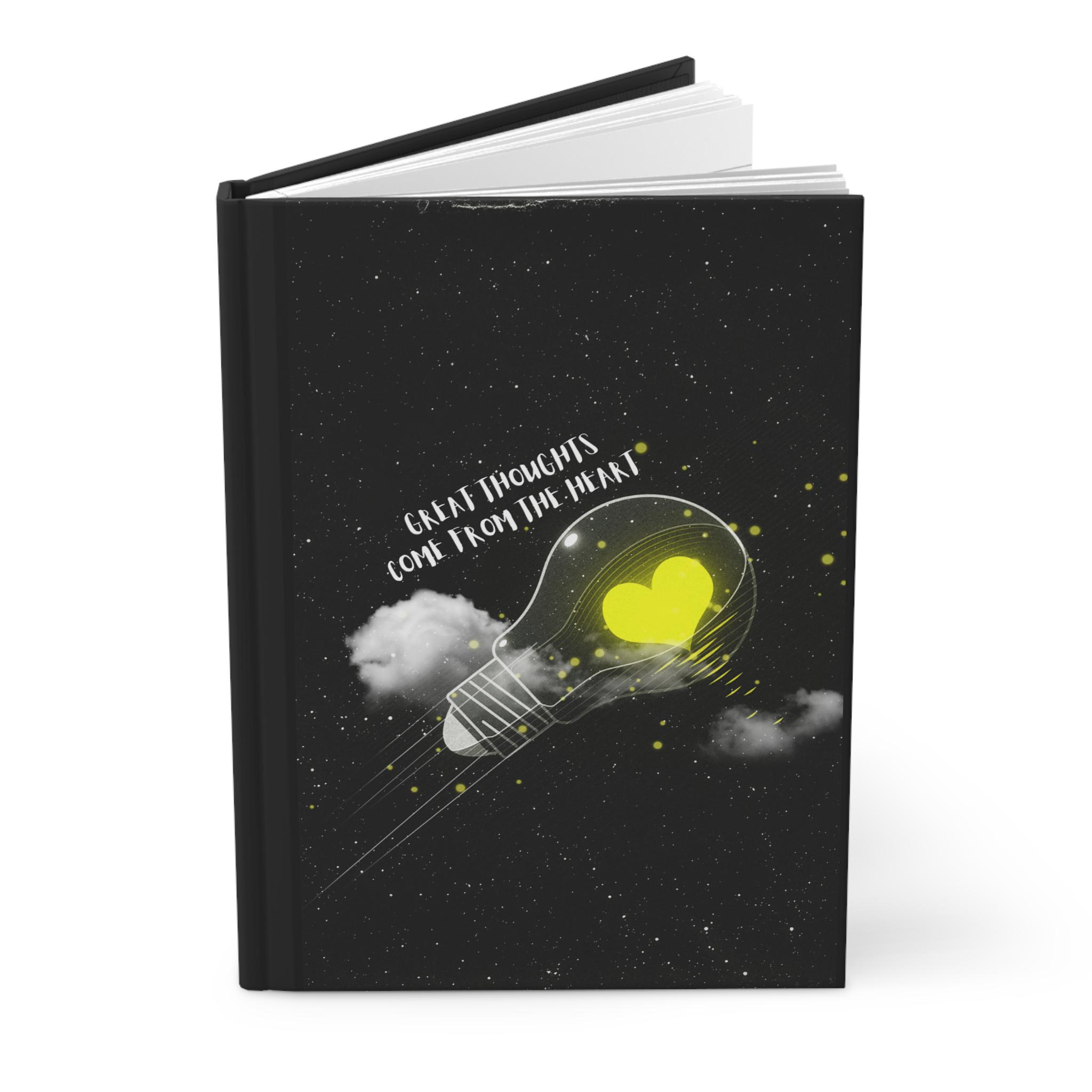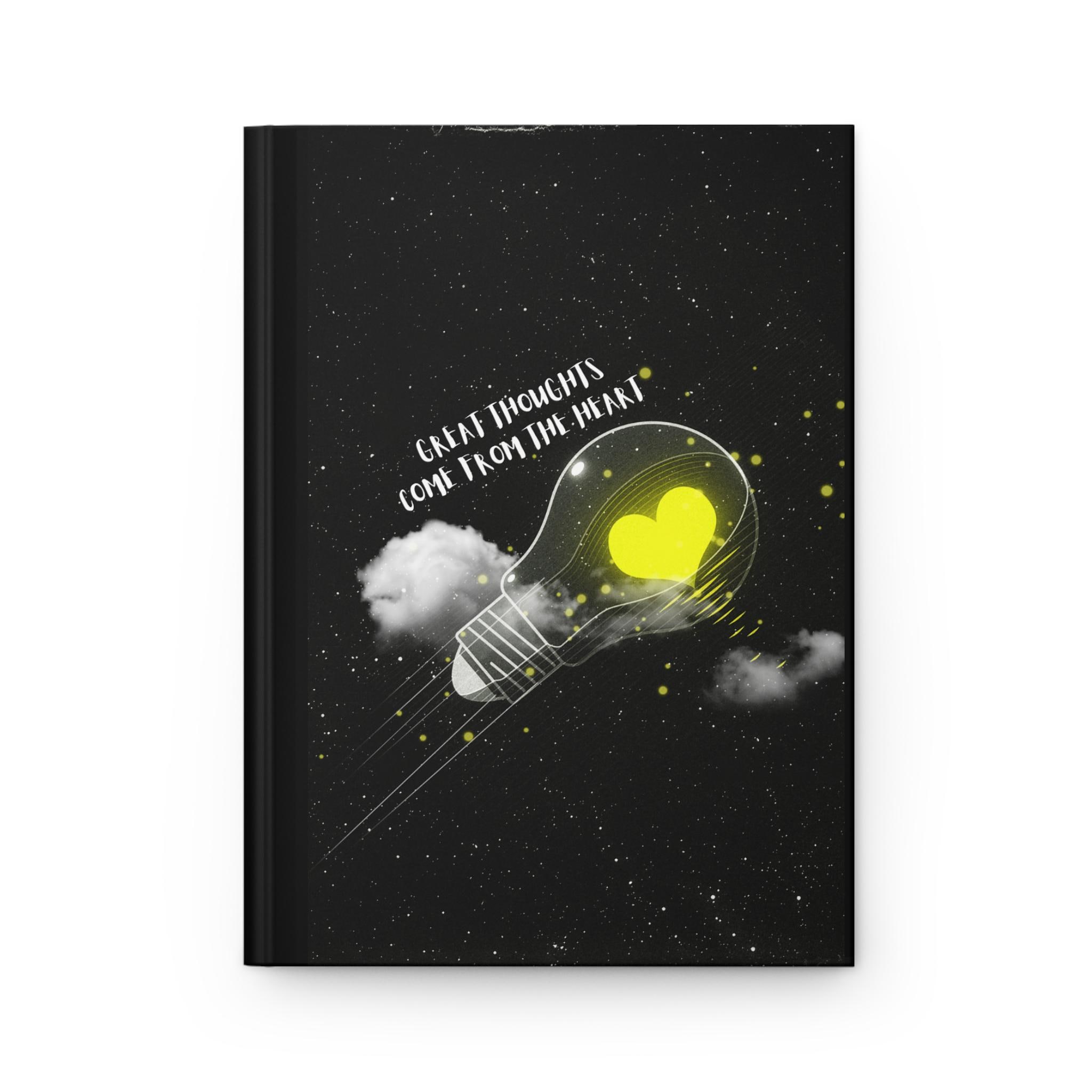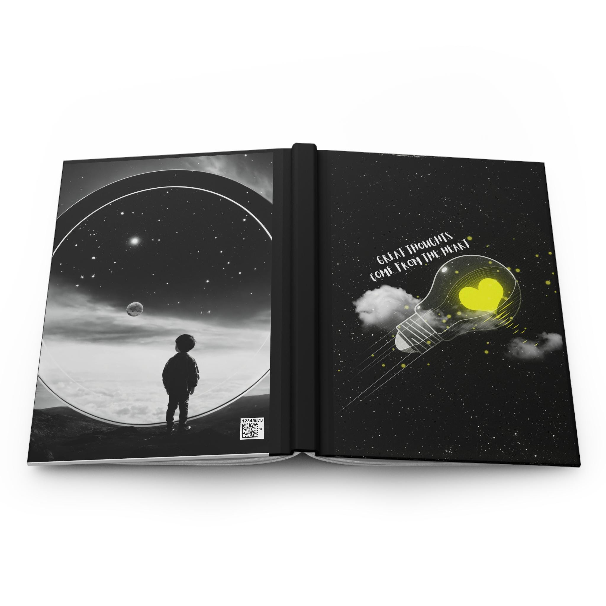 This matte hardcover journal is a quiet companion for late-night thoughts and bright ideas. The full-wrap artwork—an illuminated heart inside a drifting lightbulb on a starry backdrop, with a silhouetted child gazing into a cosmic window—sets a reflective mood. Turn the sewn spine and feel the subtle flexibility as you flip through 150 lined pages. Perforated sheets let you tear out a page to share a sketch or a note. The matte laminated cover keeps colors vivid while resisting scratches, so the imagery stays soulful for the long haul. Keep it by your bedside, slide it into a tote for a sketching walk, or use it as the place where small discoveries and big plans take shape.