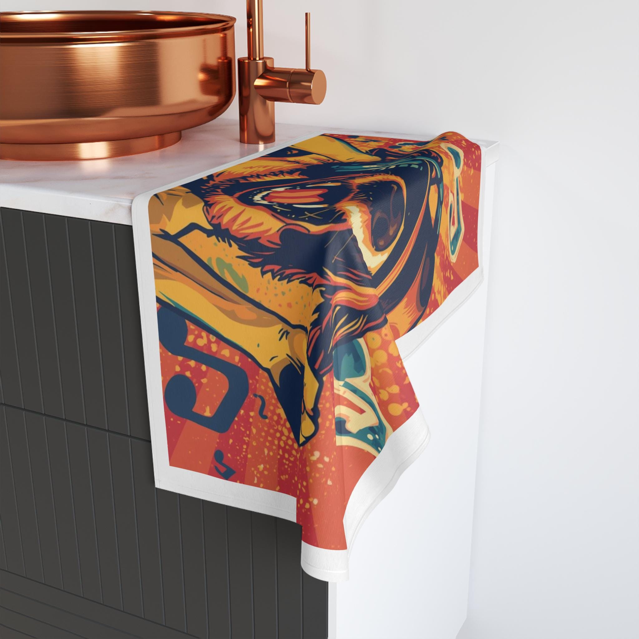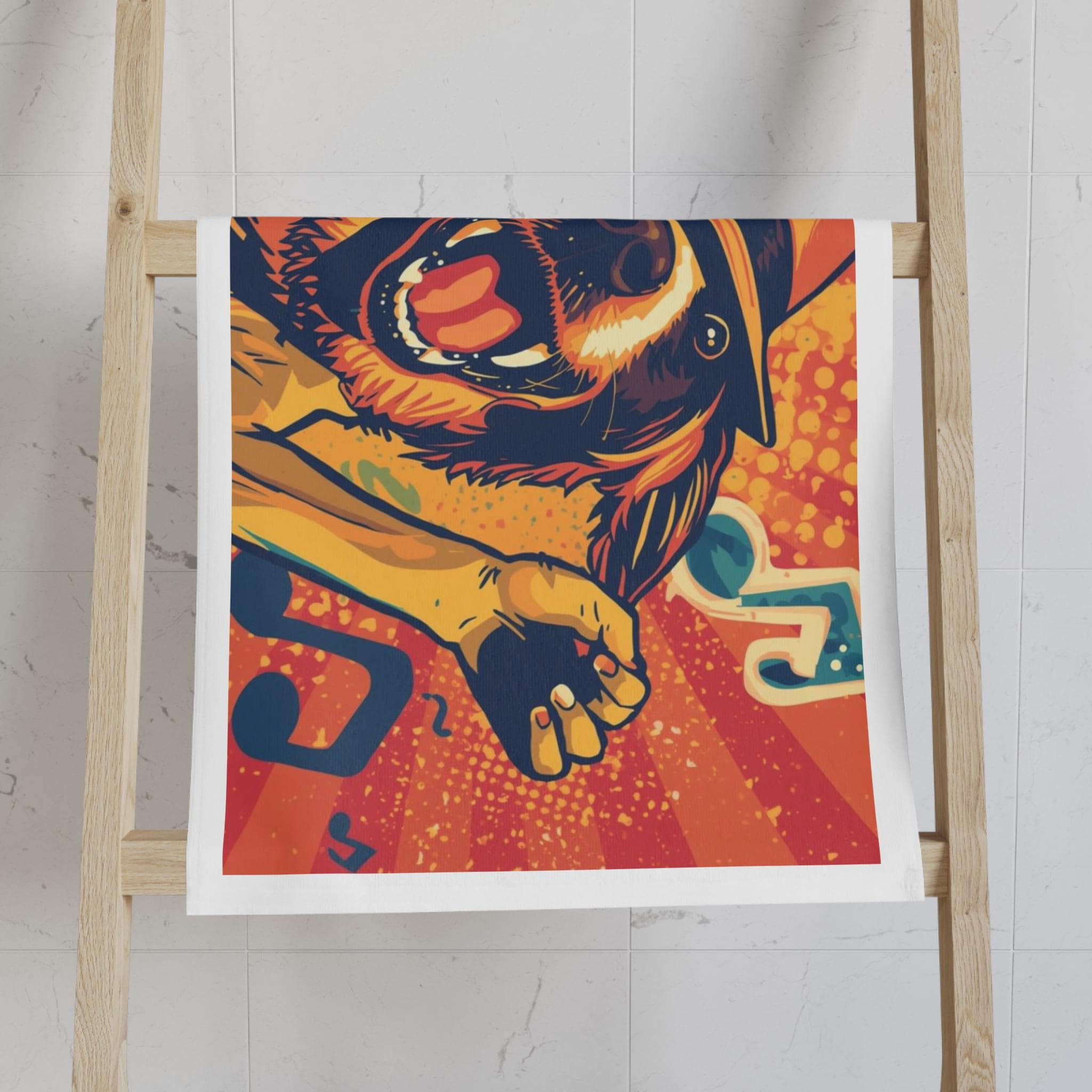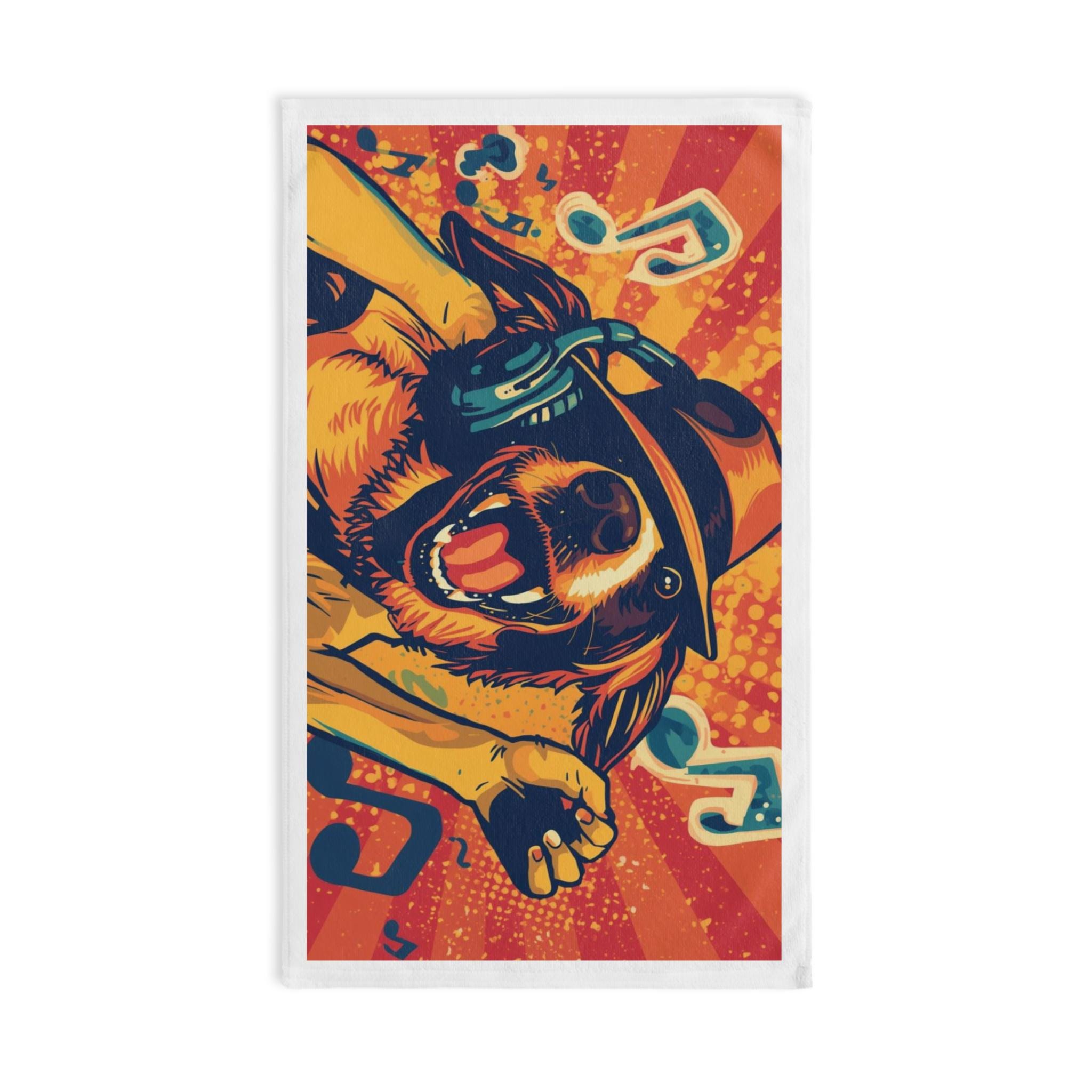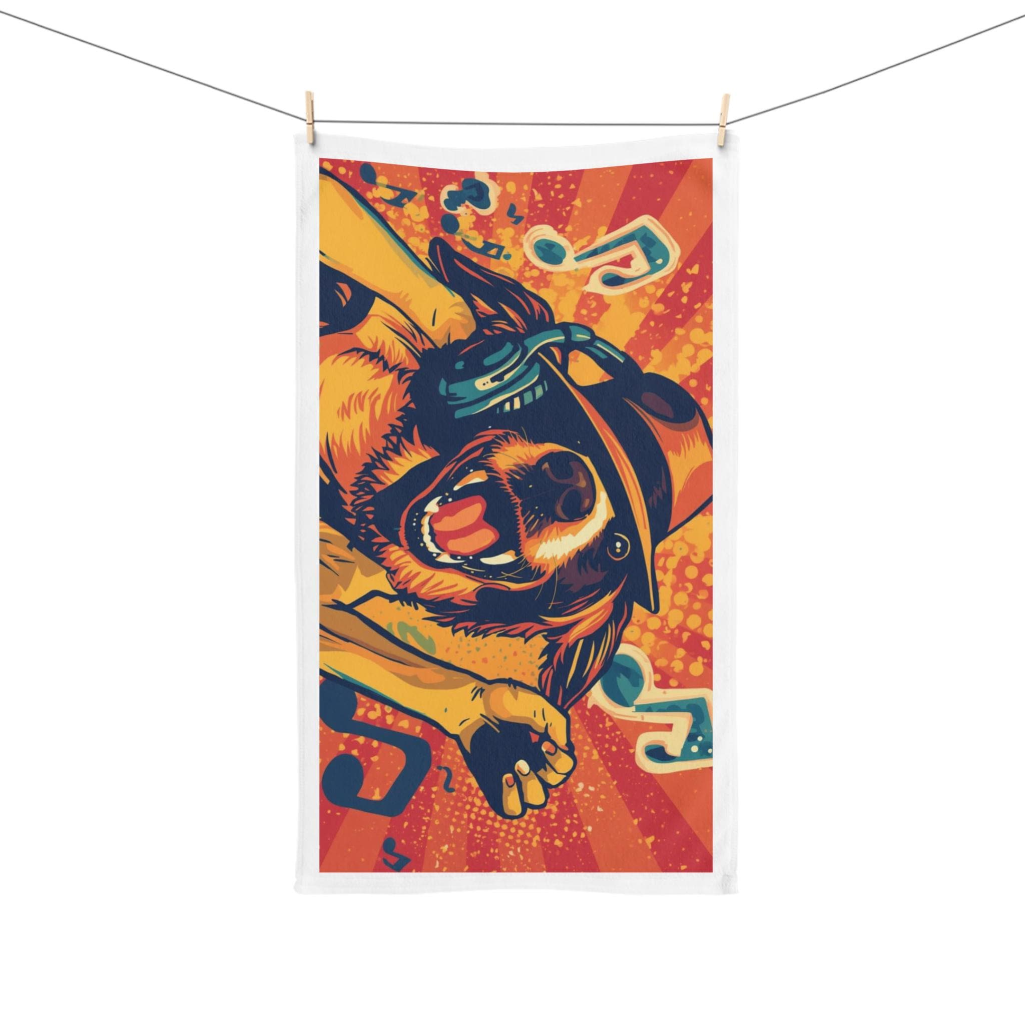 Bright, playful hand towel featuring a joyful dog lost in the music. Soft to the touch and printed on one side with vivid, high-contrast colors, this towel brings upbeat energy to everyday routines. The design—an animated dog wearing headphones and a fedora, surrounded by musical notes and warm sunburst tones—feels lively and fun. It dries quickly, holds its shape, and adds personality to a kitchen, bathroom, or studio. Fold it over a hook to catch eyes, use it between sets at rehearsal, or keep it by the sink to brighten chores and breaks with a little musical mischief.