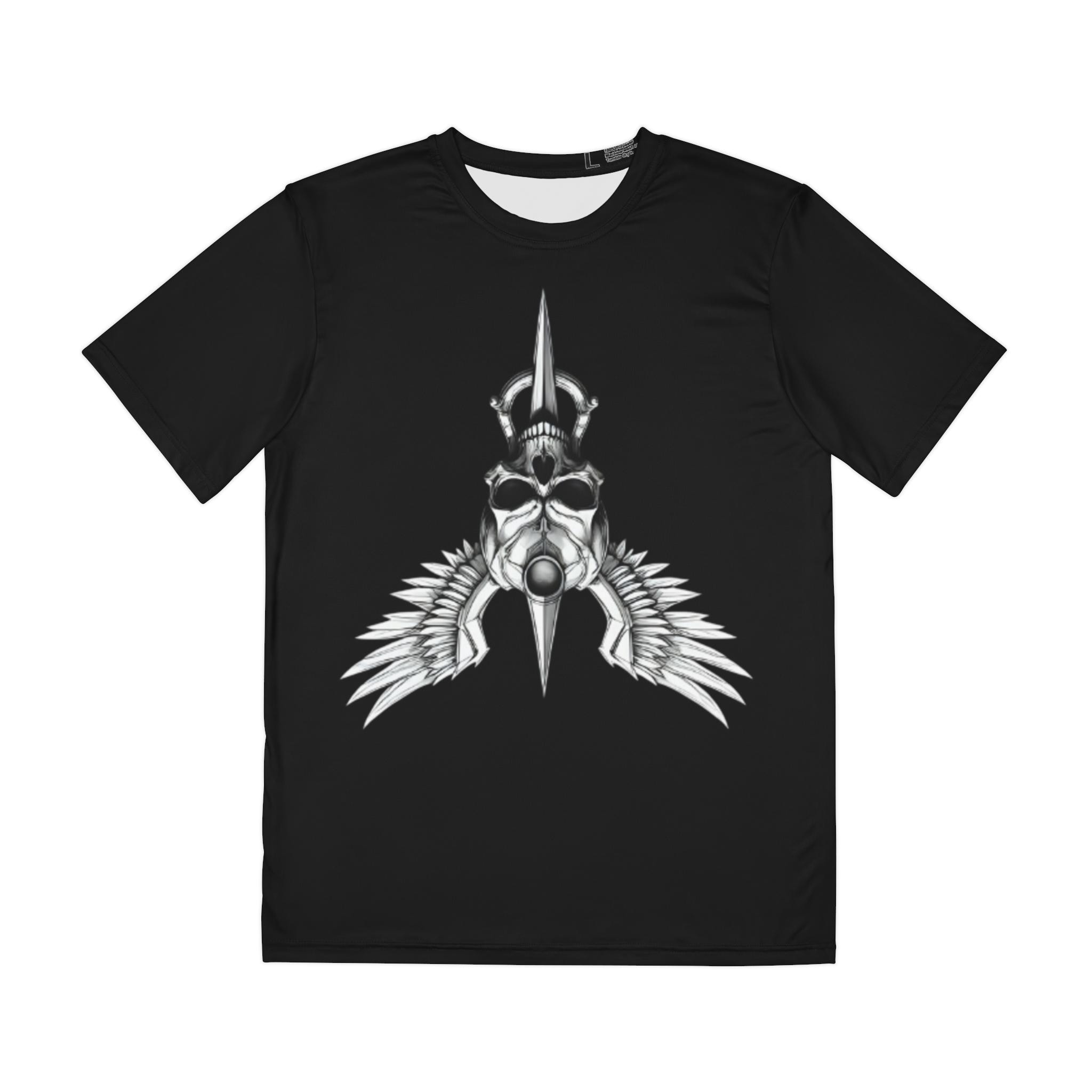 A lightweight, all-over print polyester tee that wears like armor for days you want to stand out. The monochrome emblem—an ornate, winged mask with spear-like accents—lands squarely on the chest, giving the shirt a bold, ritual feel without shouting. It moves with you and dries fast, so it’s as suited to long festival nights and hot summer runs as it is to layering under a jacket for an urban night out. The soft-brushed polyester has a smooth hand and subtle sheen that keeps the artwork crisp and the silhouette clean. Wear it when you want an edgy, tribal-tech look that reads strong and purposeful.