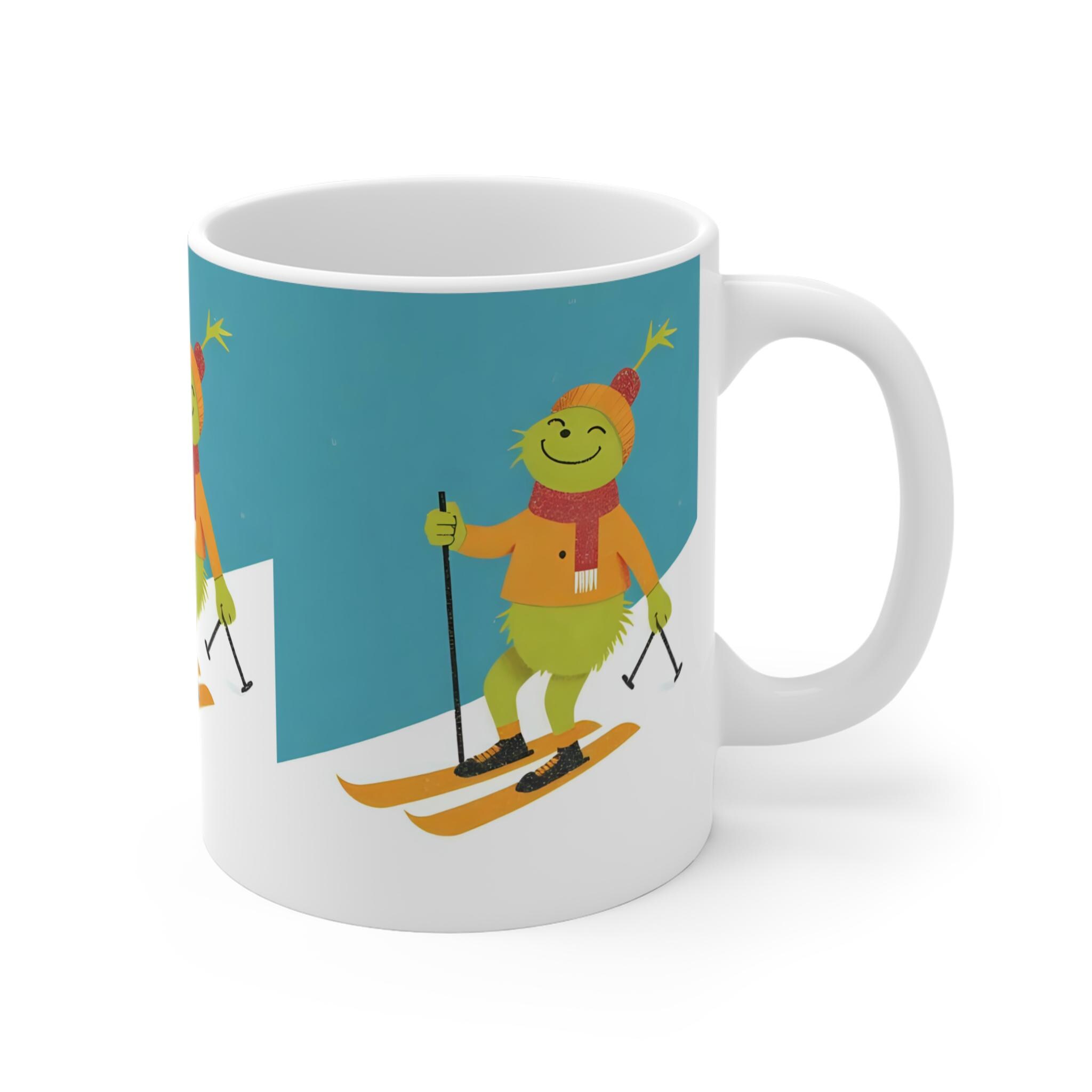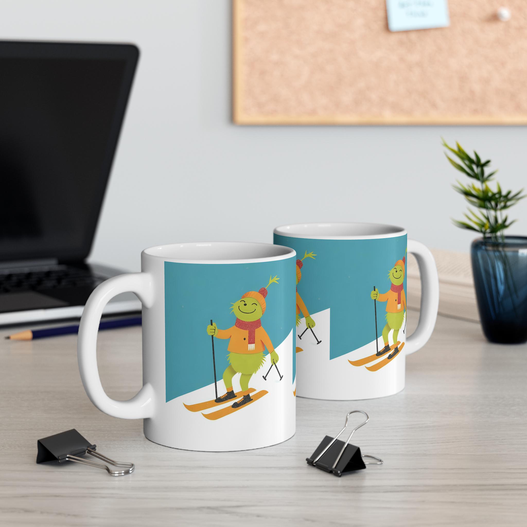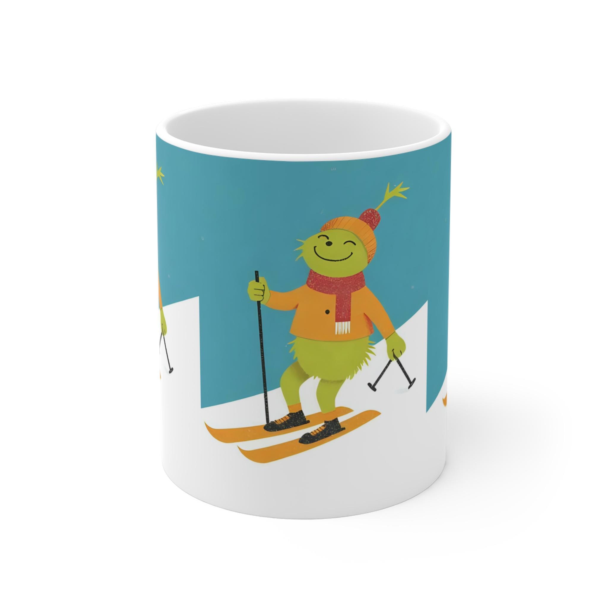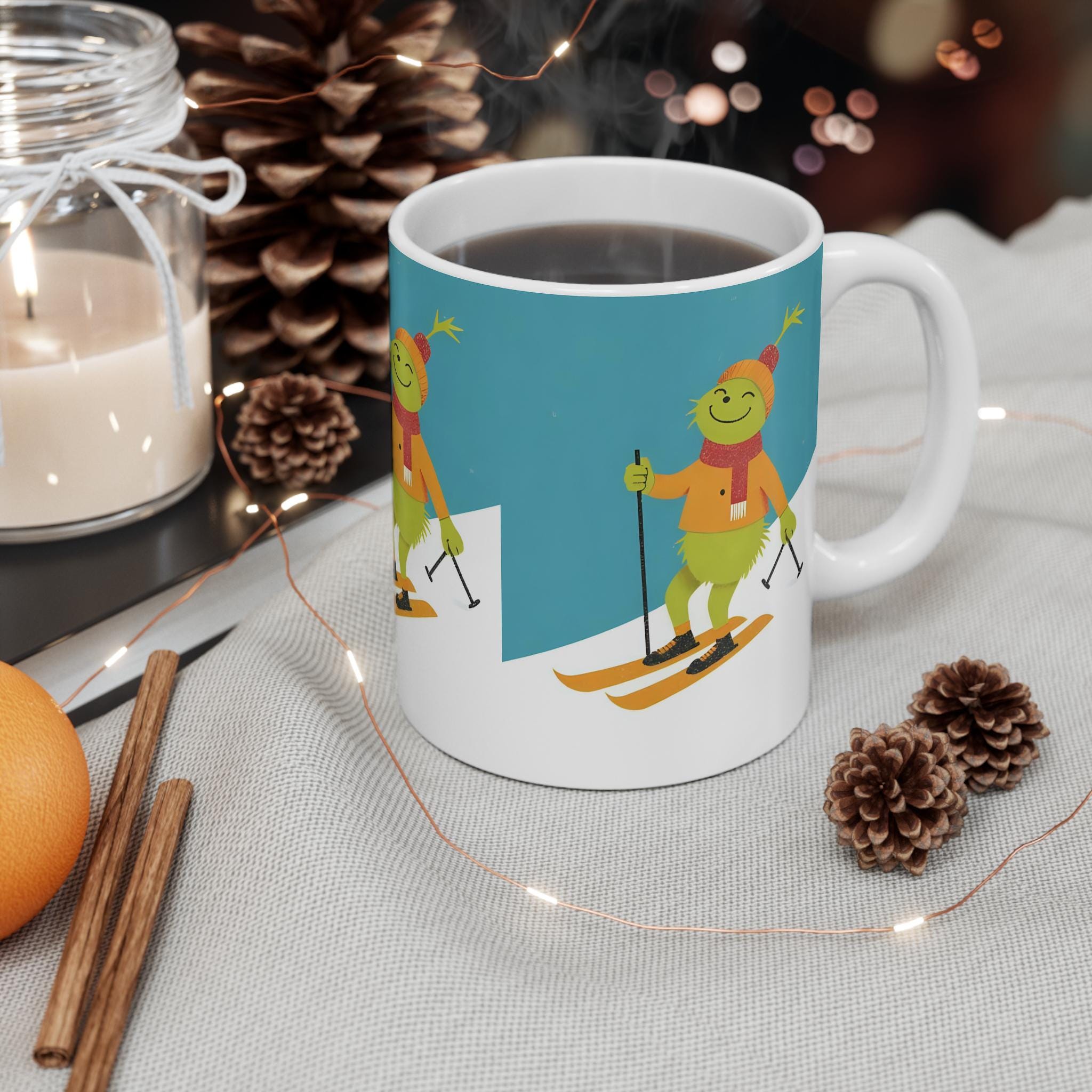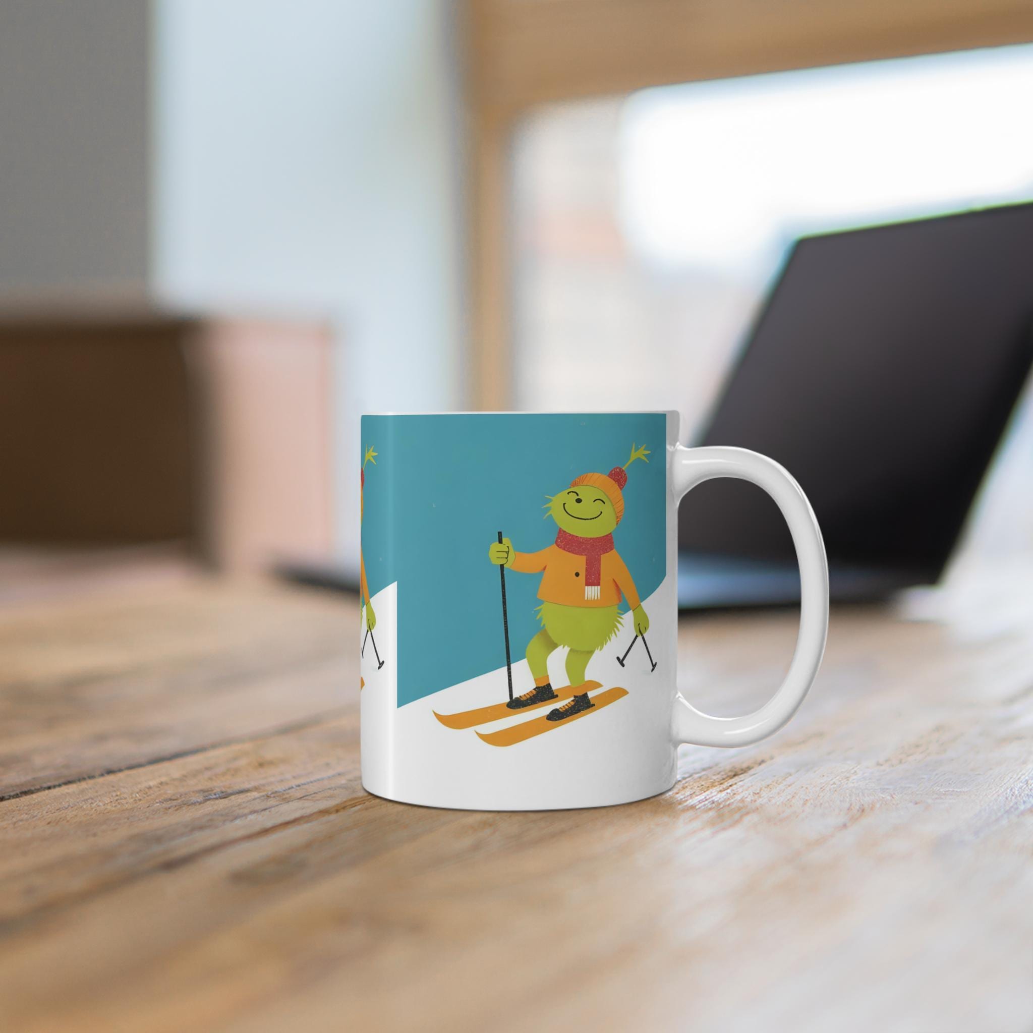 Wrap your hands around a little bit of winter sunshine. This 11oz ceramic mug features a cheerful, retro-style skier in bright winter colors — a playful companion for slow mornings, mid-day breaks, or evening cocoa. The smooth white ceramic and C-handle feel familiar and comfortable. Dishwasher- and microwave-safe, it fits easily into a busy routine without fuss. It brings a lighthearted, cozy mood to ski-lodge chats, holiday prep, or quiet moments by the window watching snow fall.