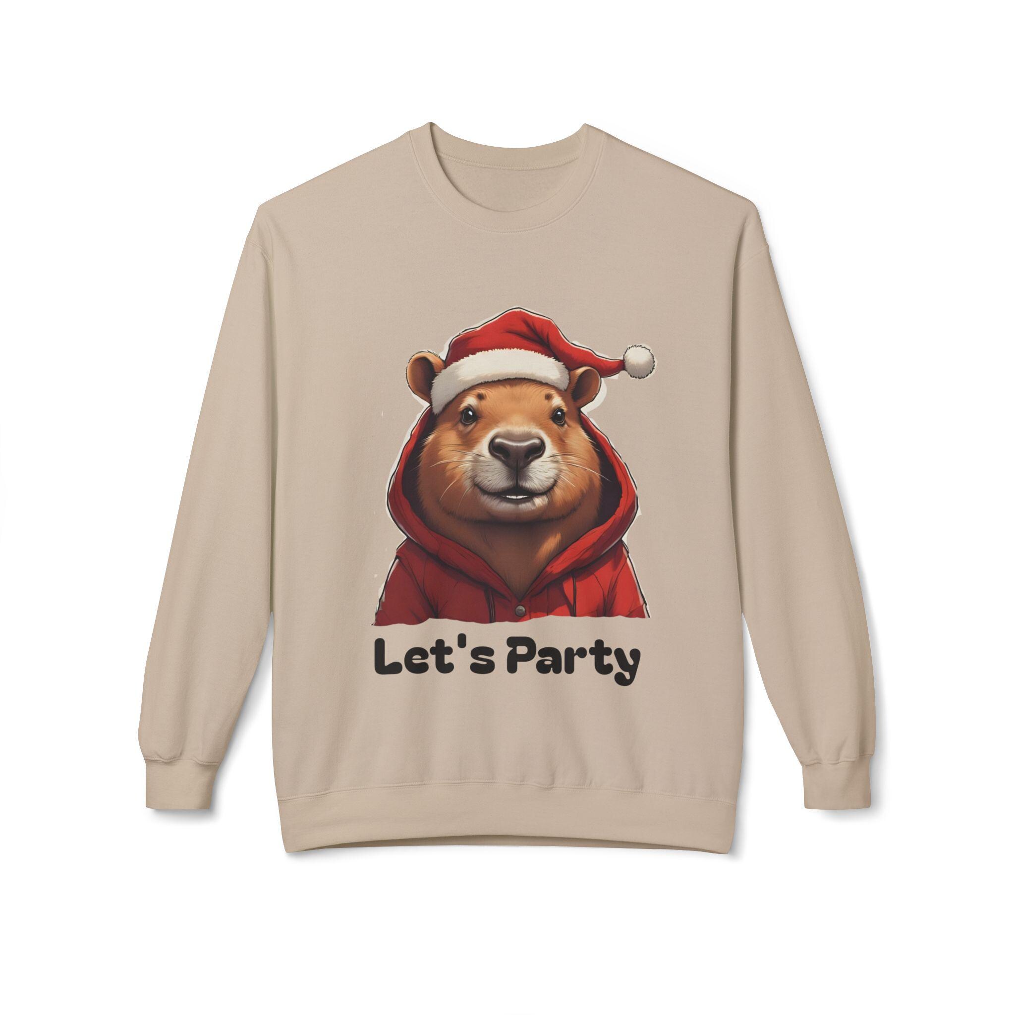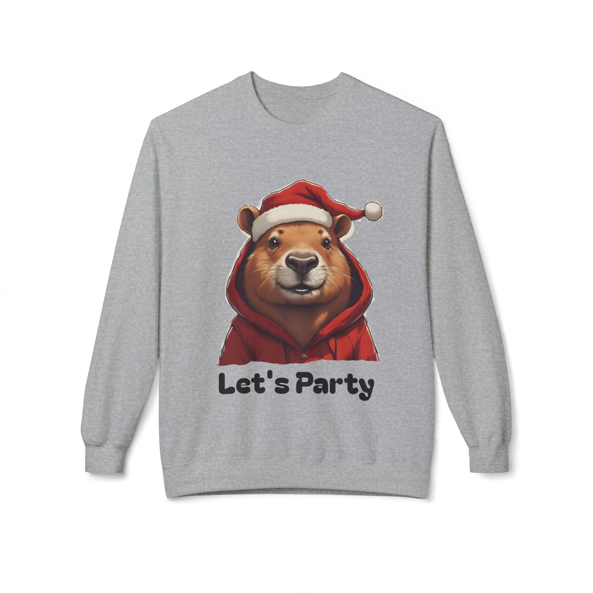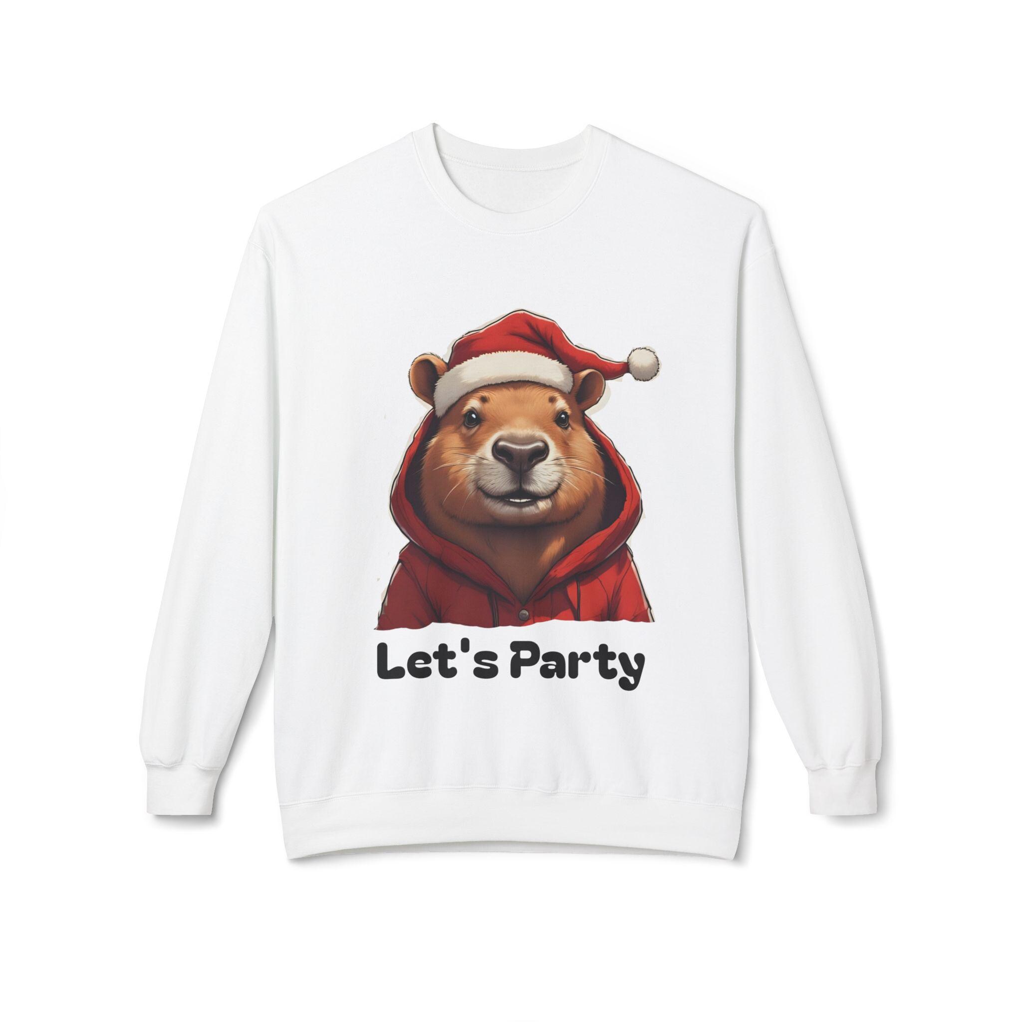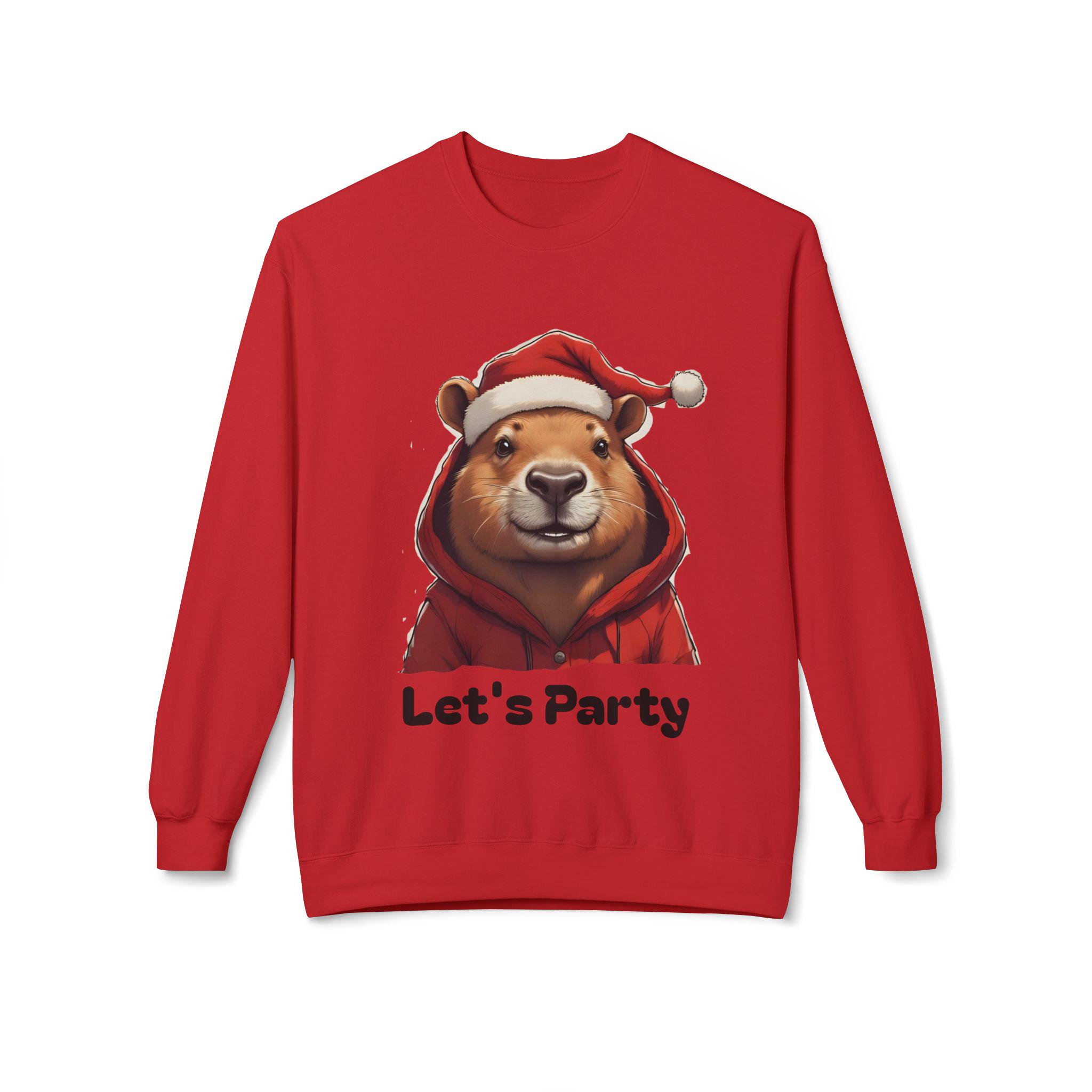 A cozy midweight crewneck sweatshirt featuring a playful bear in a red hoodie and Santa hat with the cheerful caption “Let’s Party!”. Soft ring-spun cotton and polyester knit gives a warm, slightly structured feel that holds printed detail well. The relaxed dropped shoulders and classic fit make it easy to layer over shirts or wear on its own for low-key holiday gatherings. Subtle ribbed cuffs and hem with spandex keep the shape after wear, while the tubular, no-side-seam construction produces a smooth, clean silhouette. This sweatshirt brings a bit of winter whimsy to casual days—wear it to light up a party, family movie night, or a stroll through snowy streets.