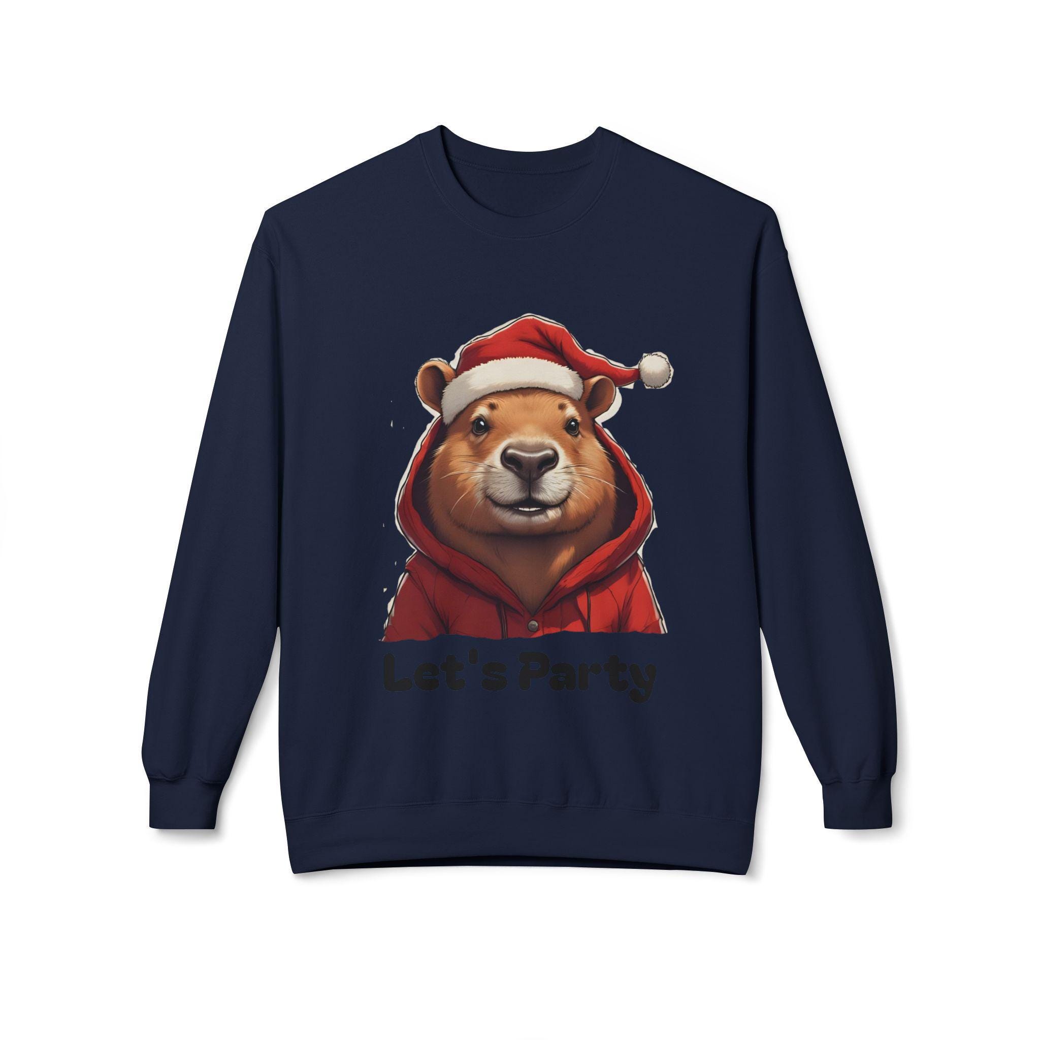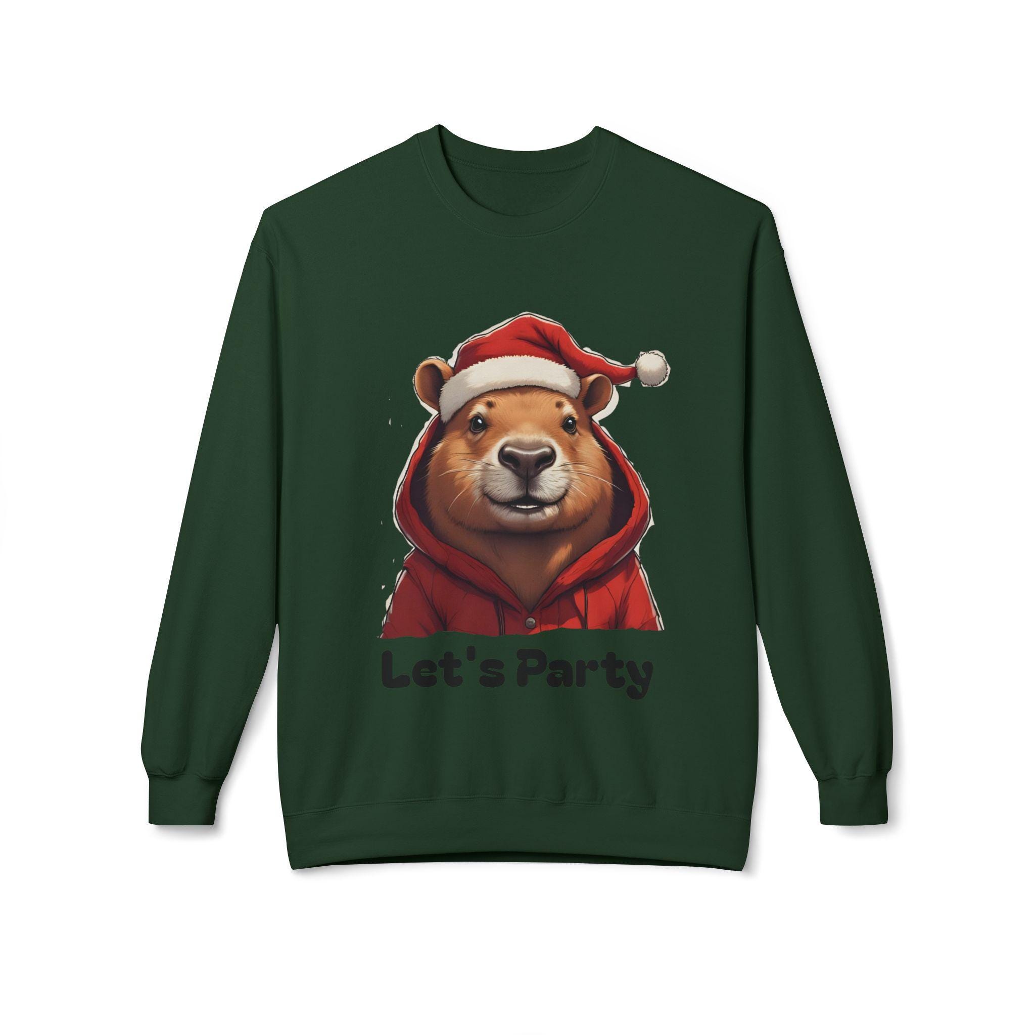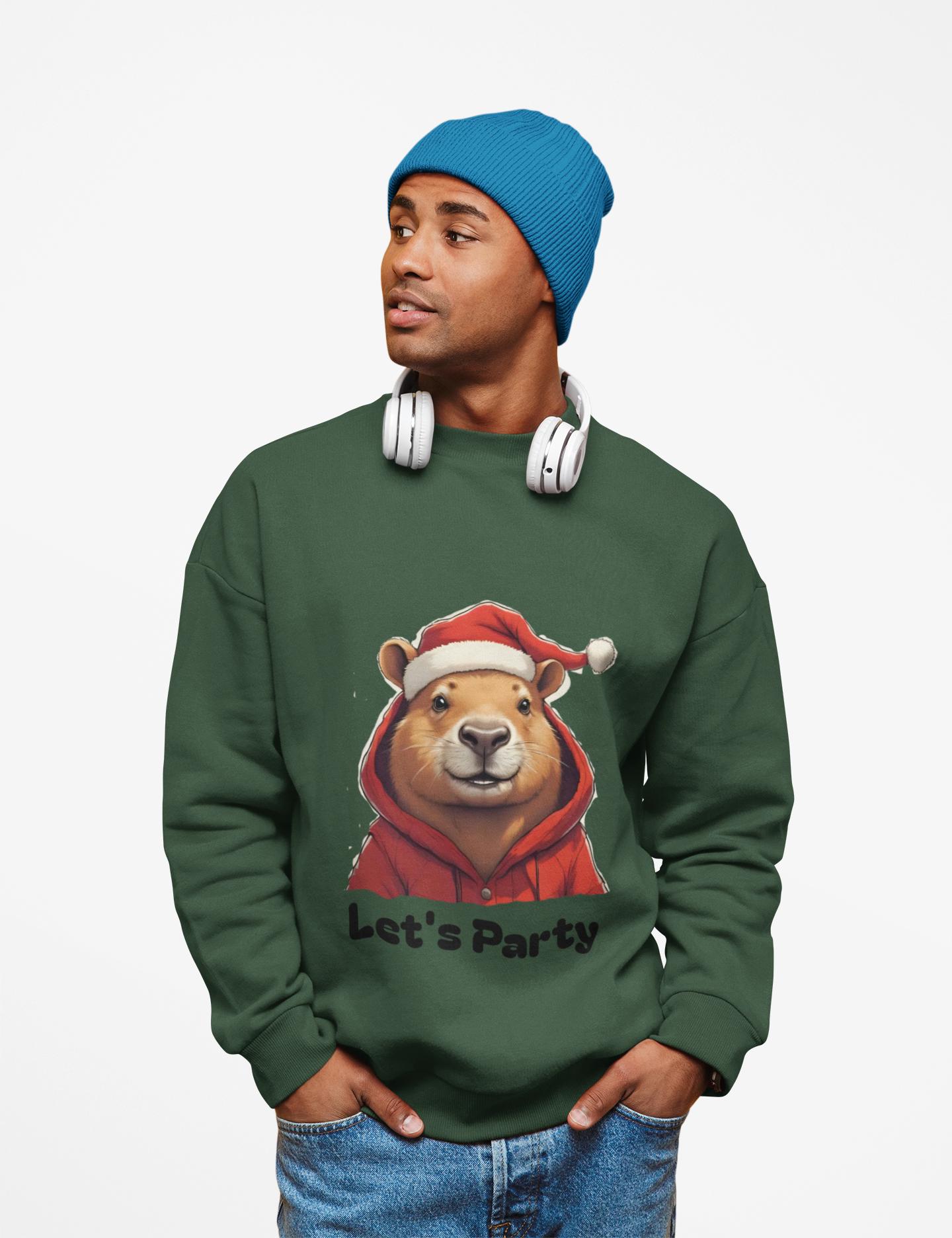 A cozy midweight crewneck sweatshirt featuring a playful bear in a red hoodie and Santa hat with the cheerful caption “Let’s Party!”. Soft ring-spun cotton and polyester knit gives a warm, slightly structured feel that holds printed detail well. The relaxed dropped shoulders and classic fit make it easy to layer over shirts or wear on its own for low-key holiday gatherings. Subtle ribbed cuffs and hem with spandex keep the shape after wear, while the tubular, no-side-seam construction produces a smooth, clean silhouette. This sweatshirt brings a bit of winter whimsy to casual days—wear it to light up a party, family movie night, or a stroll through snowy streets.