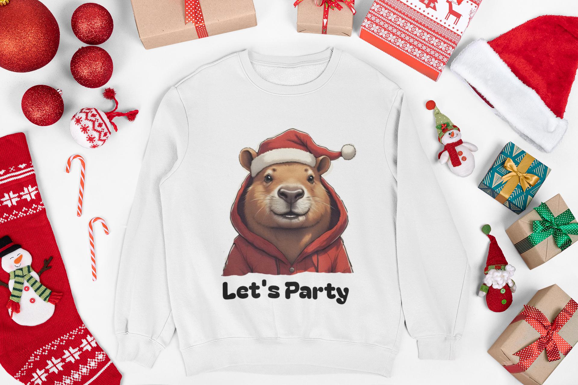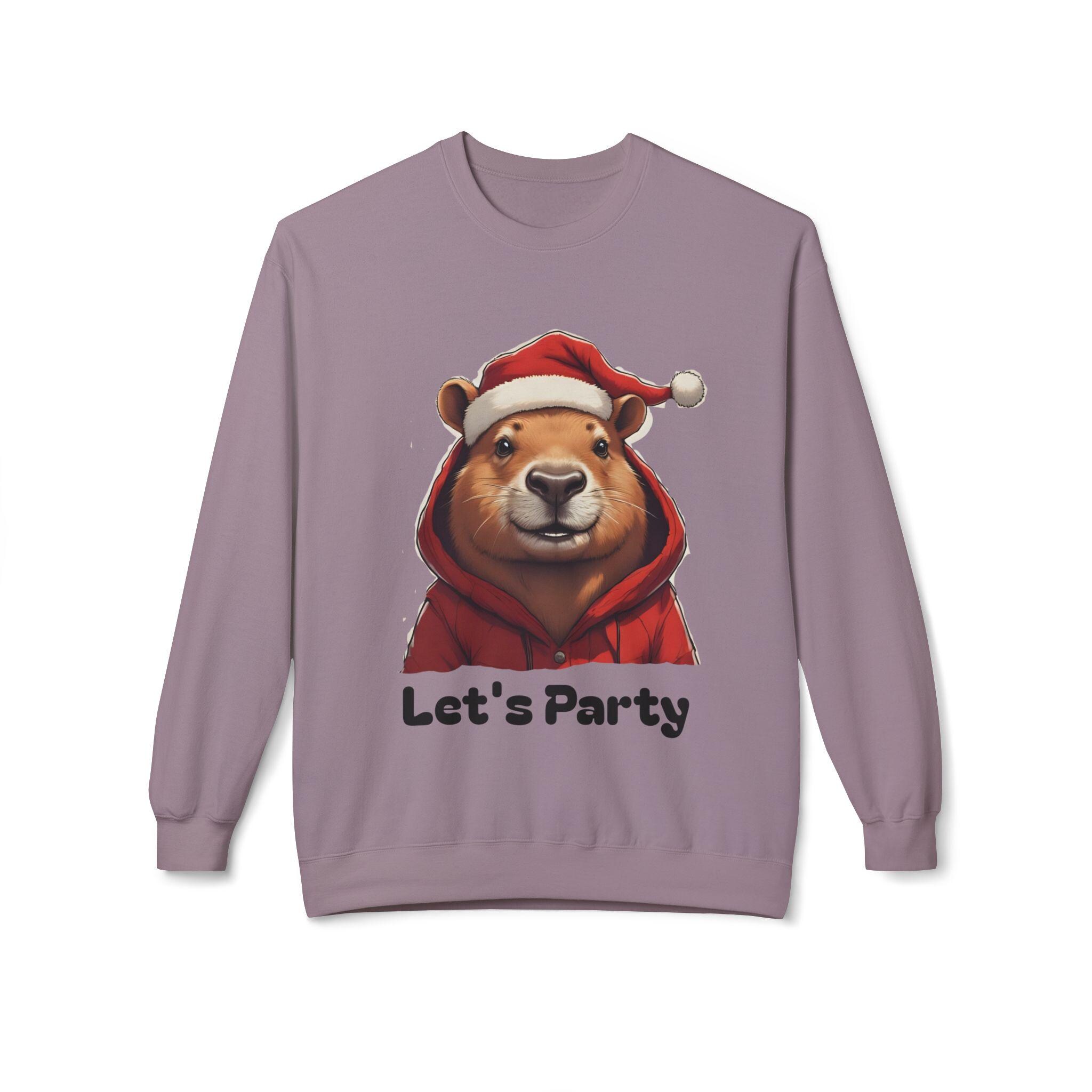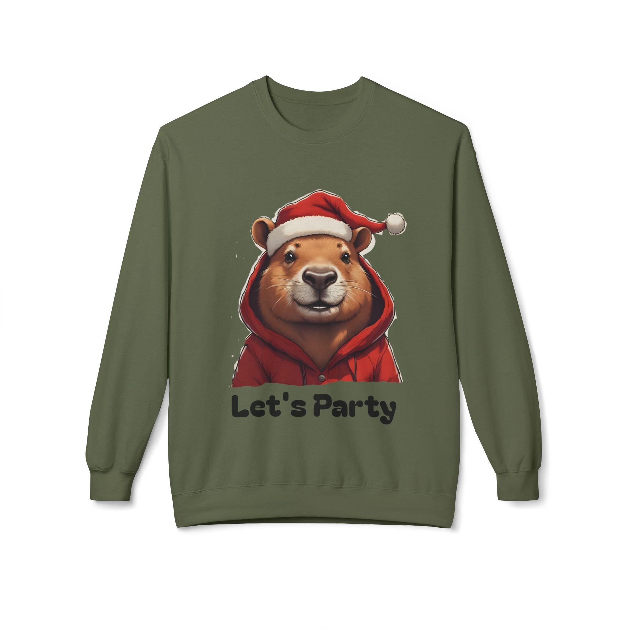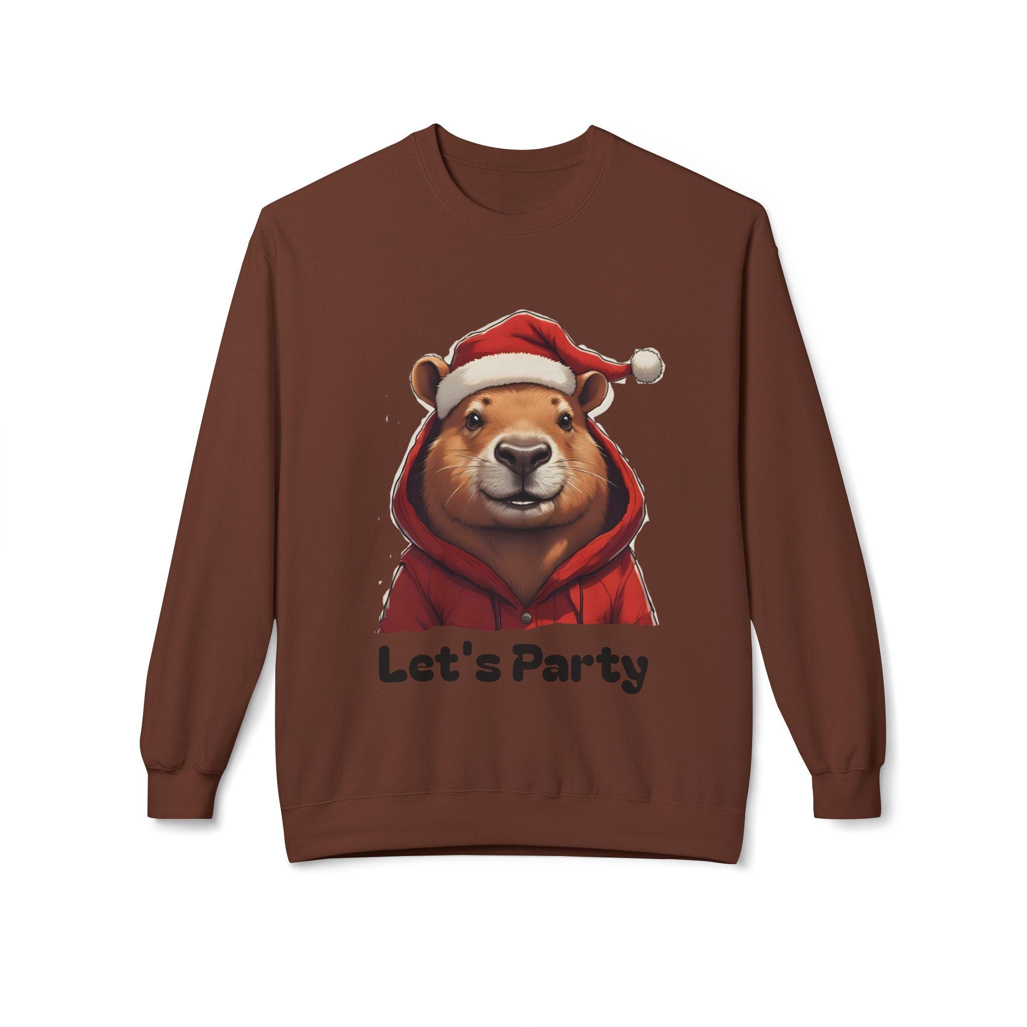 A cozy midweight crewneck sweatshirt featuring a playful bear in a red hoodie and Santa hat with the cheerful caption “Let’s Party!”. Soft ring-spun cotton and polyester knit gives a warm, slightly structured feel that holds printed detail well. The relaxed dropped shoulders and classic fit make it easy to layer over shirts or wear on its own for low-key holiday gatherings. Subtle ribbed cuffs and hem with spandex keep the shape after wear, while the tubular, no-side-seam construction produces a smooth, clean silhouette. This sweatshirt brings a bit of winter whimsy to casual days—wear it to light up a party, family movie night, or a stroll through snowy streets.