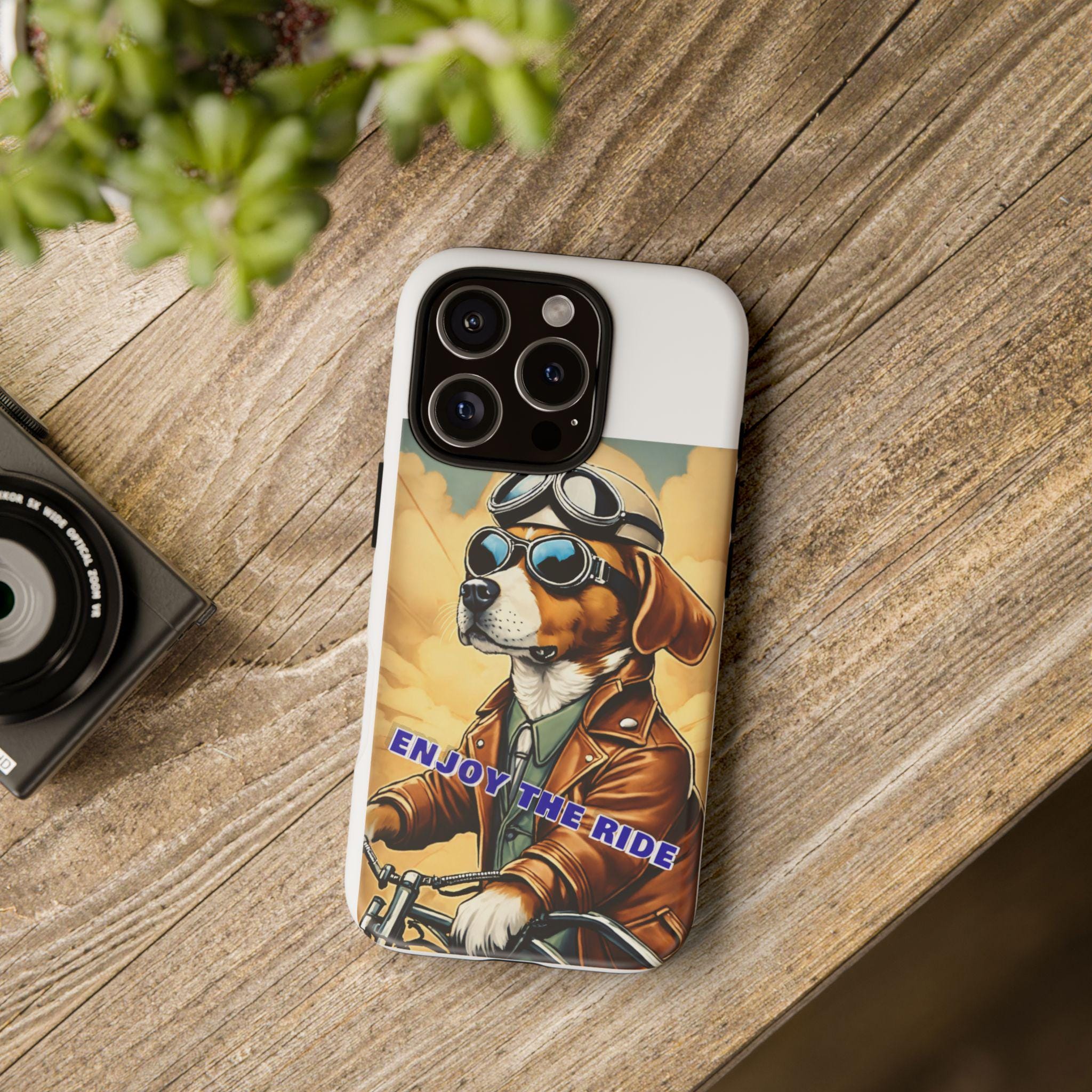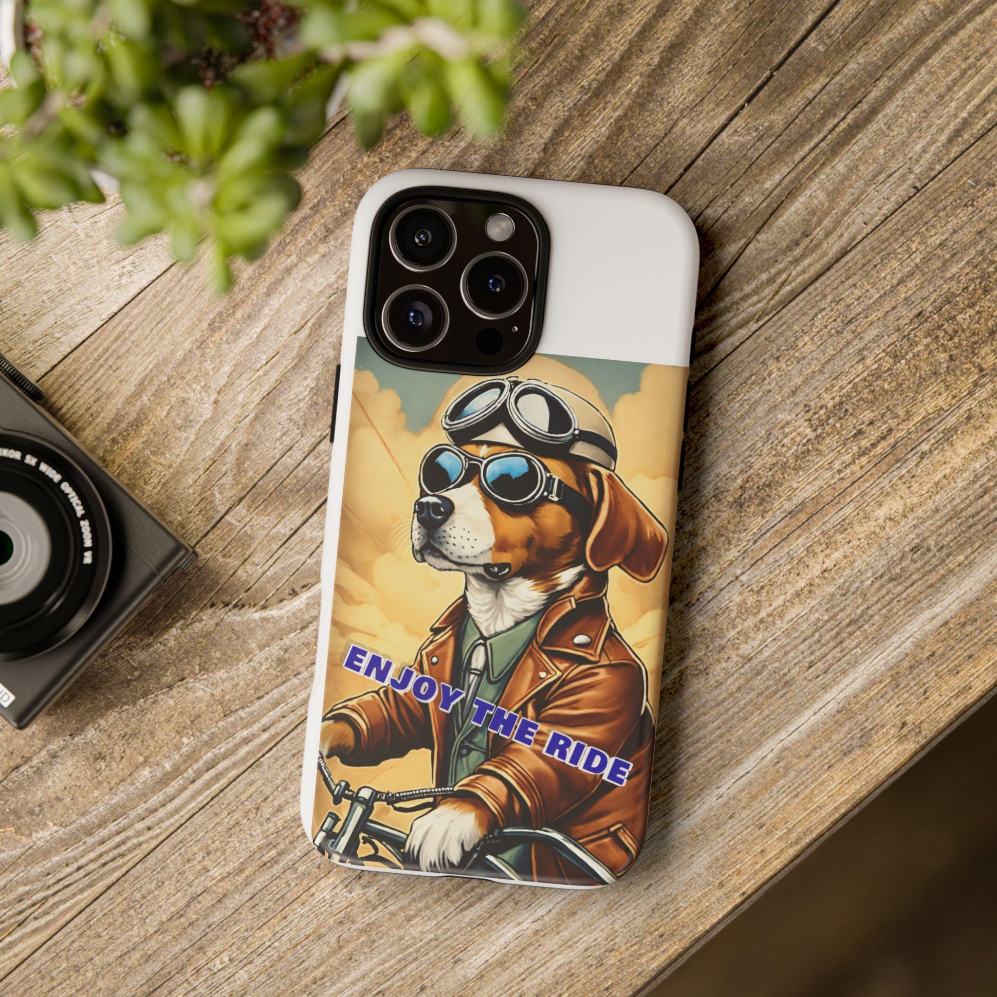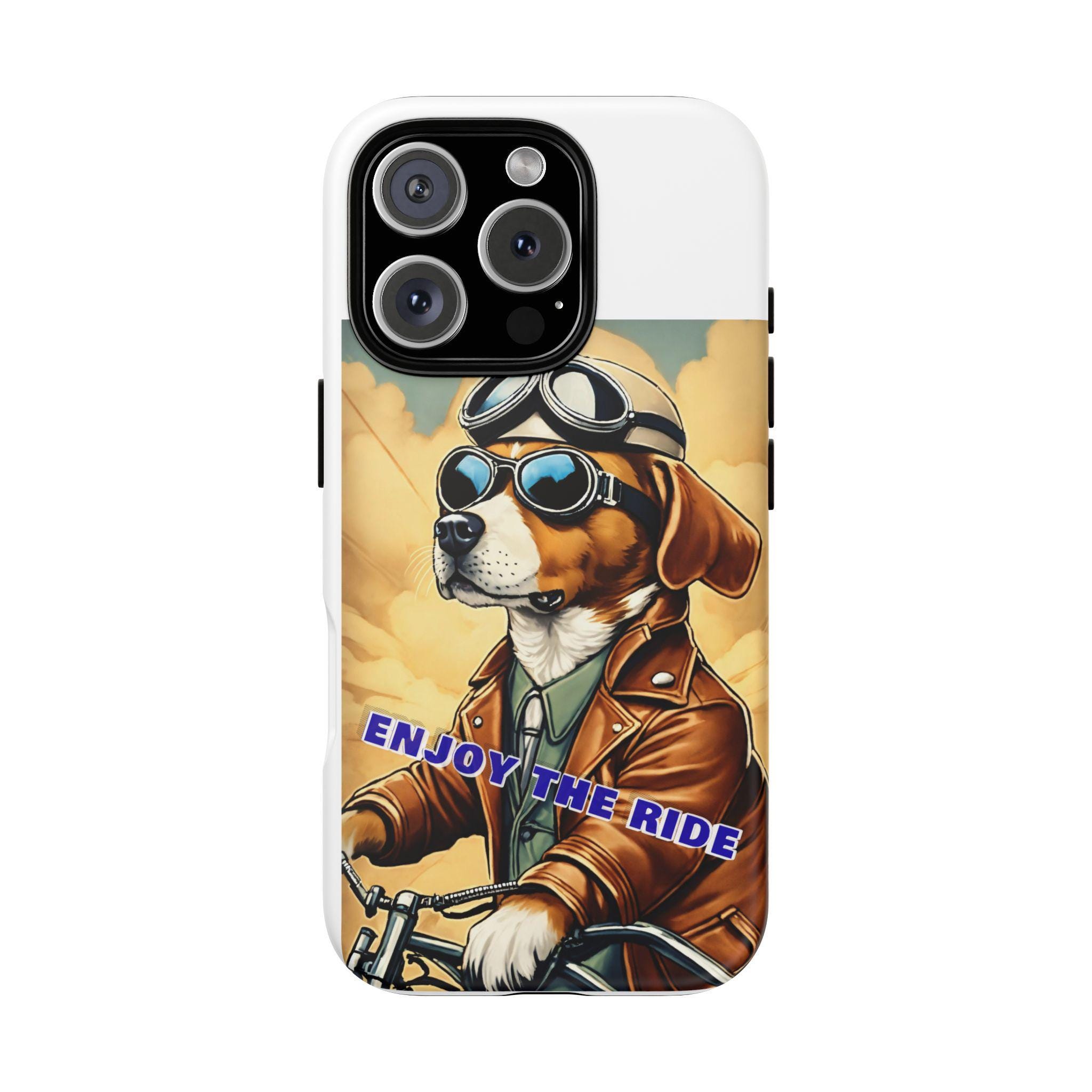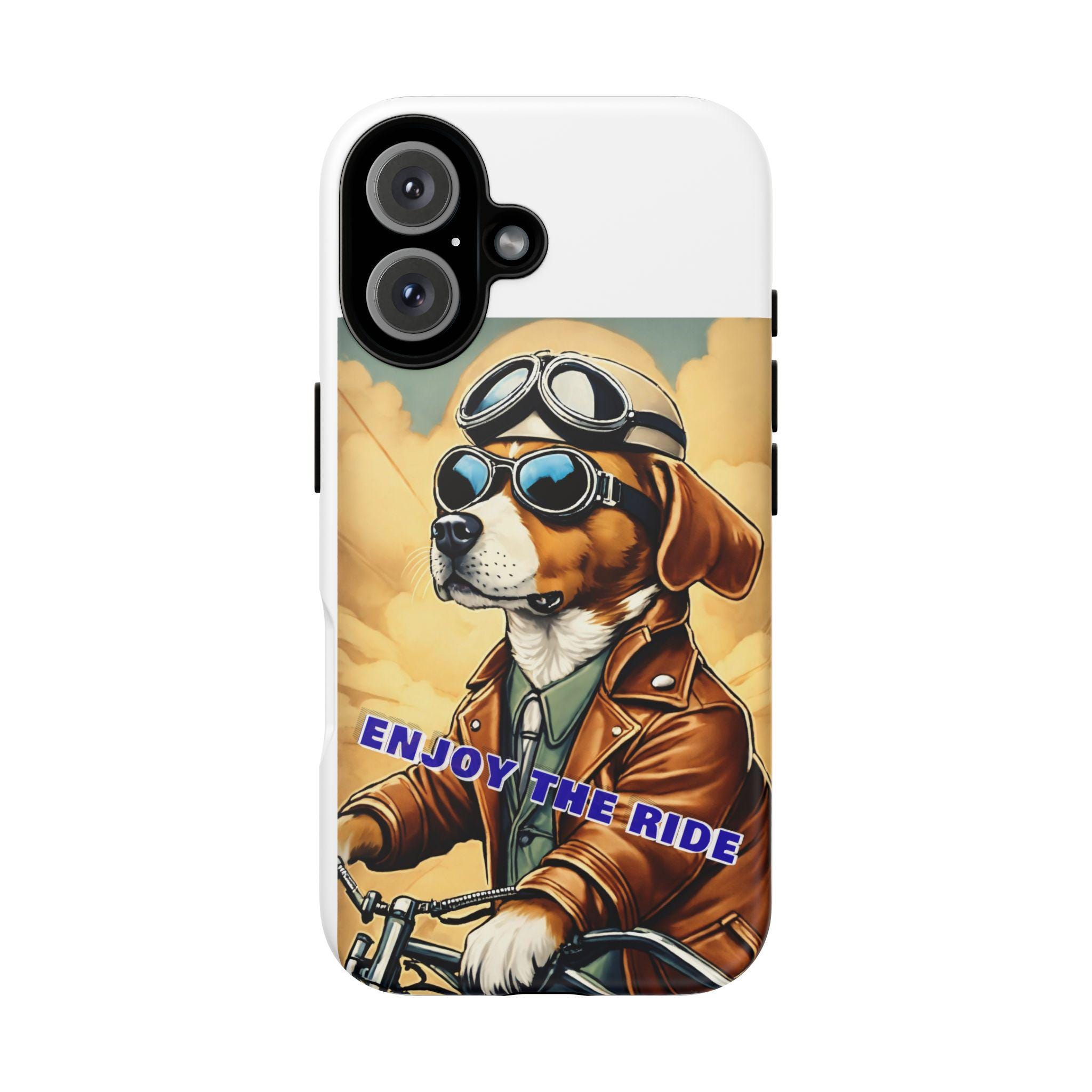 This protective phone case brings playful vintage energy to your daily carry. A retro-styled beagle in aviator goggles and a leather jacket rides toward a golden sky, the slogan “ENJOY THE RIDE” running across the art. The case balances bold, full-wrap color with a slim, dual-layer construction so your phone looks lively while staying protected from drops and daily wear. The glossy or matte finish options keep the image vibrant and weather-resistant, and the precise cutouts preserve full connectivity and wireless charging support. Thoughtful materials and certifications mean durable use without compromising on style.