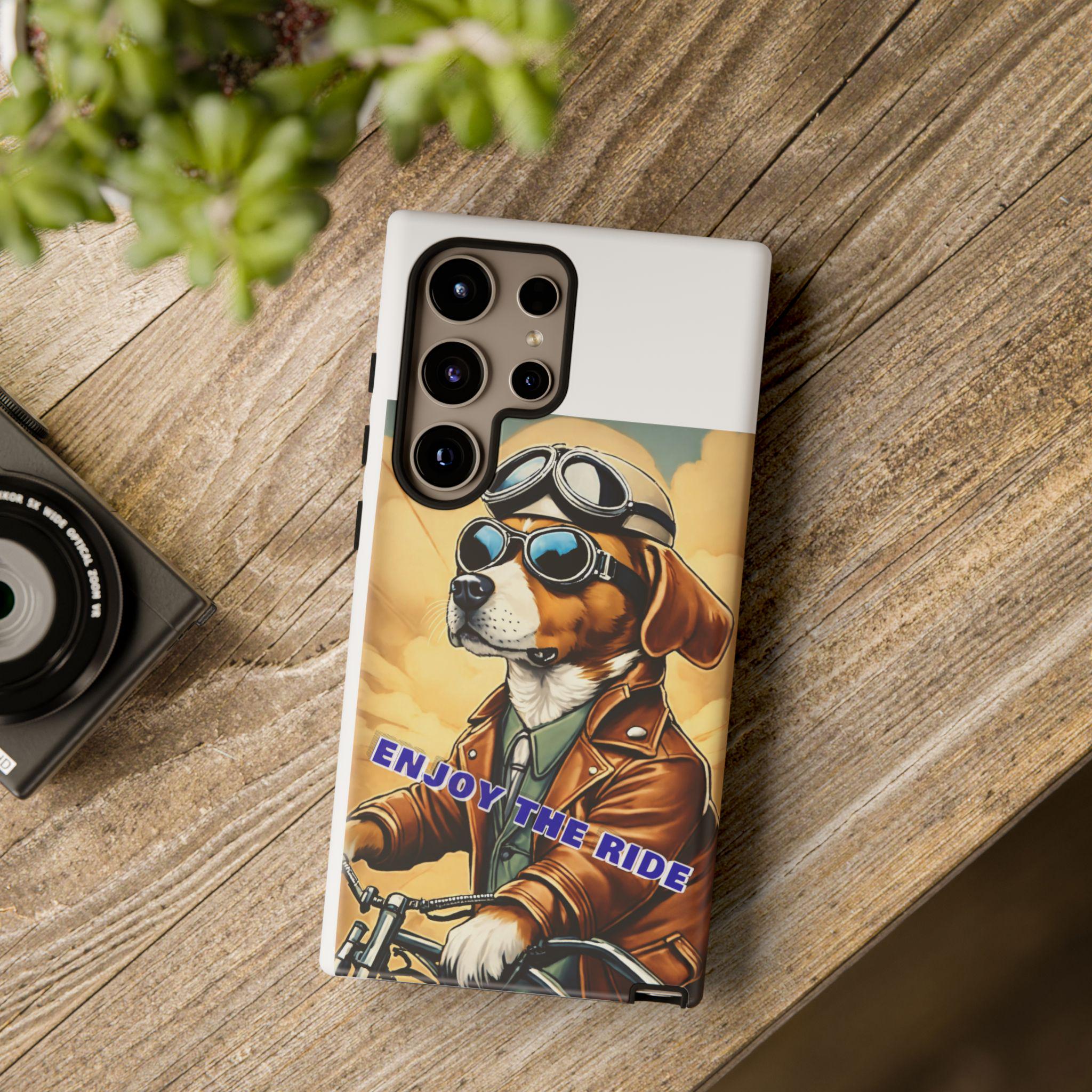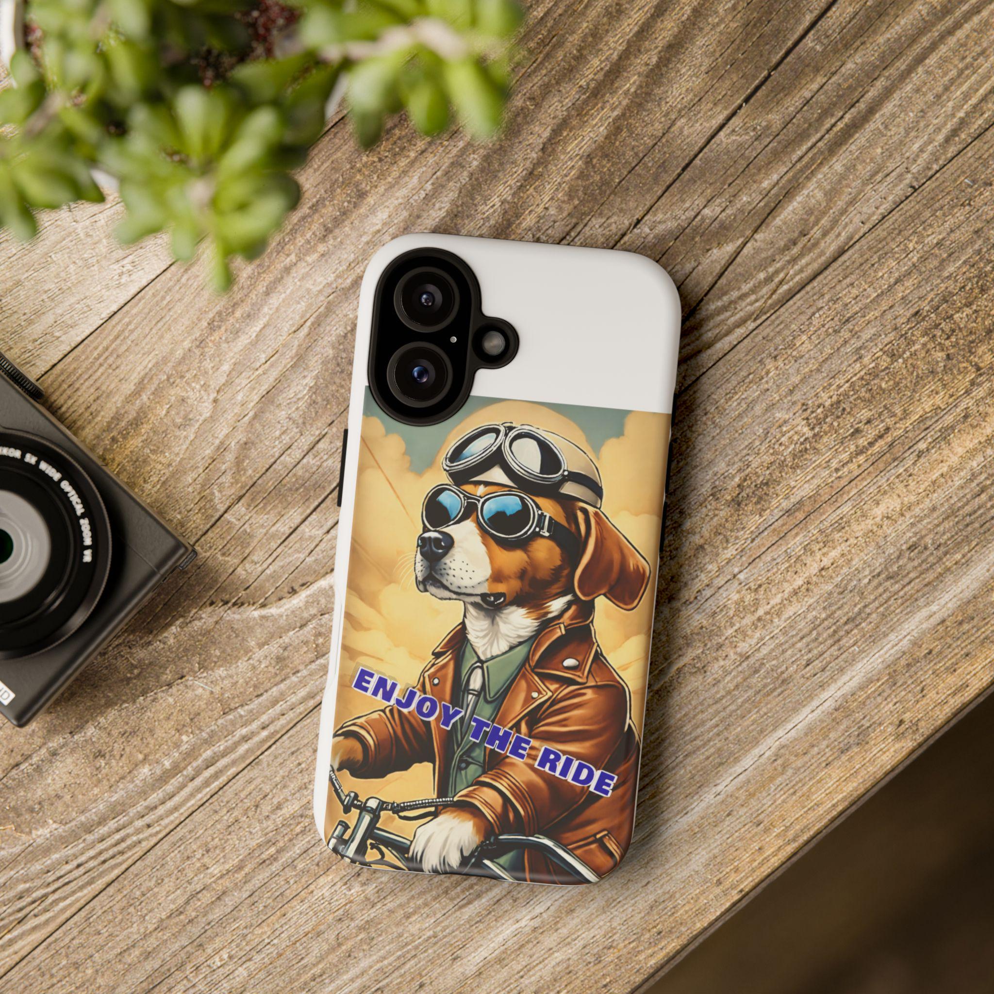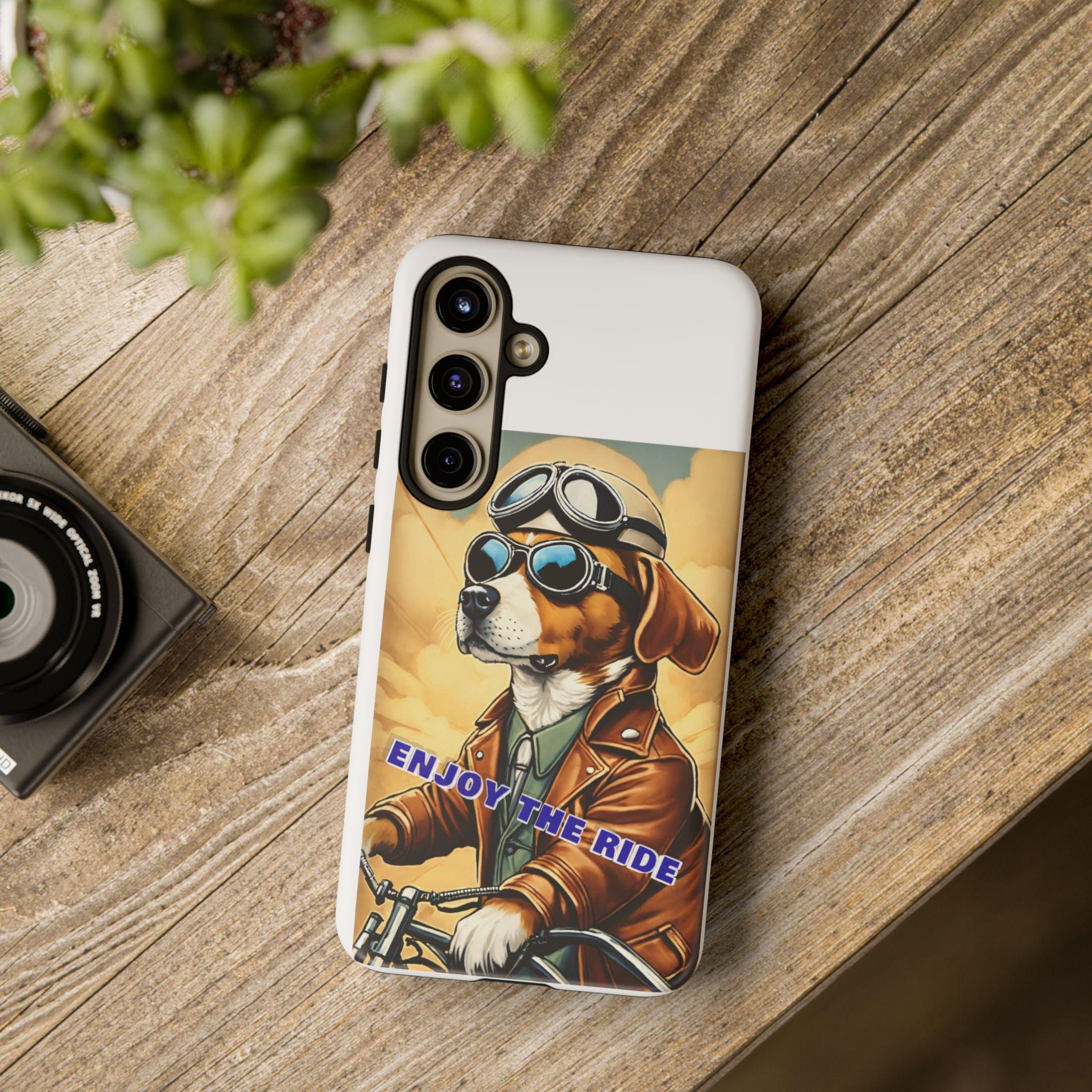 This protective phone case brings playful vintage energy to your daily carry. A retro-styled beagle in aviator goggles and a leather jacket rides toward a golden sky, the slogan “ENJOY THE RIDE” running across the art. The case balances bold, full-wrap color with a slim, dual-layer construction so your phone looks lively while staying protected from drops and daily wear. The glossy or matte finish options keep the image vibrant and weather-resistant, and the precise cutouts preserve full connectivity and wireless charging support. Thoughtful materials and certifications mean durable use without compromising on style.