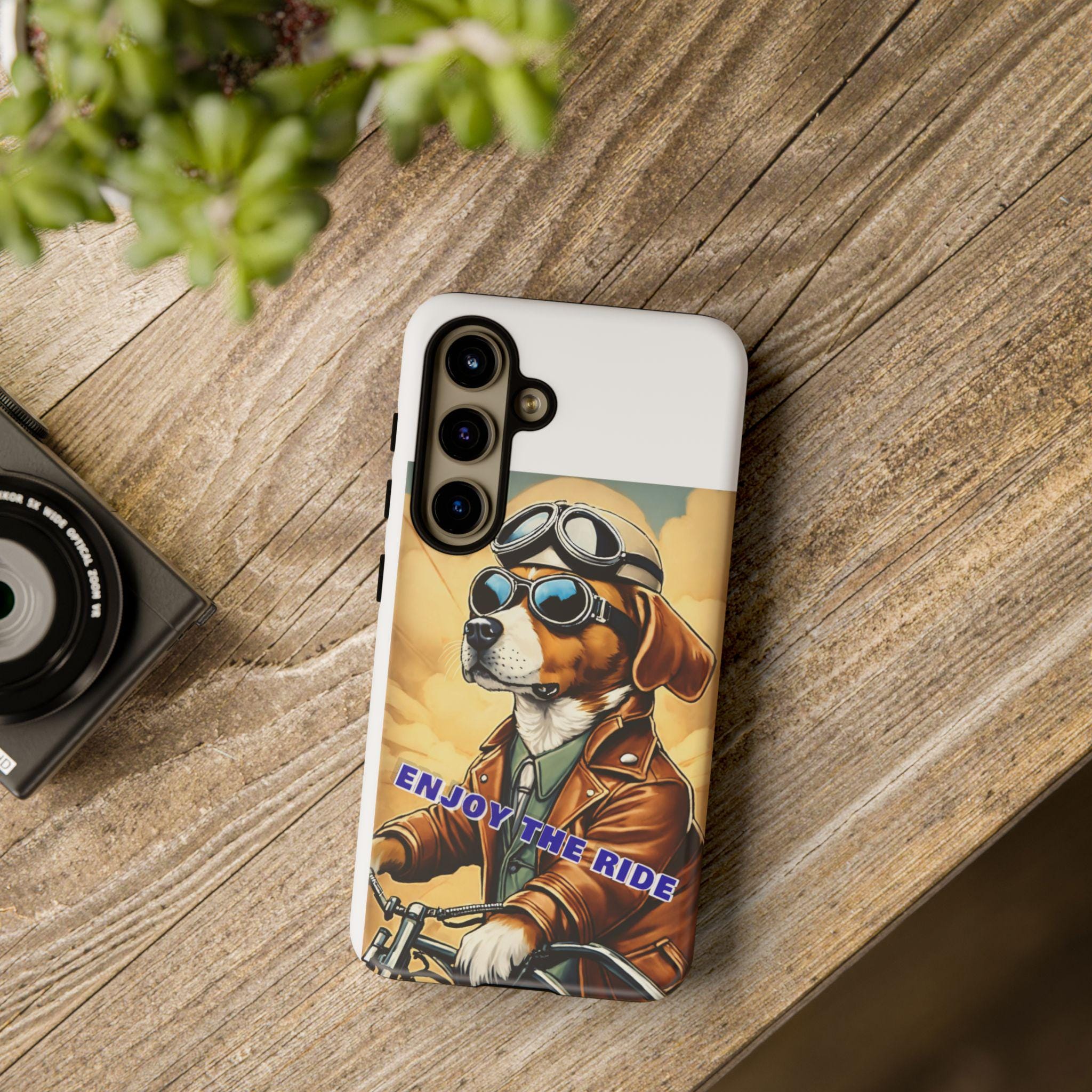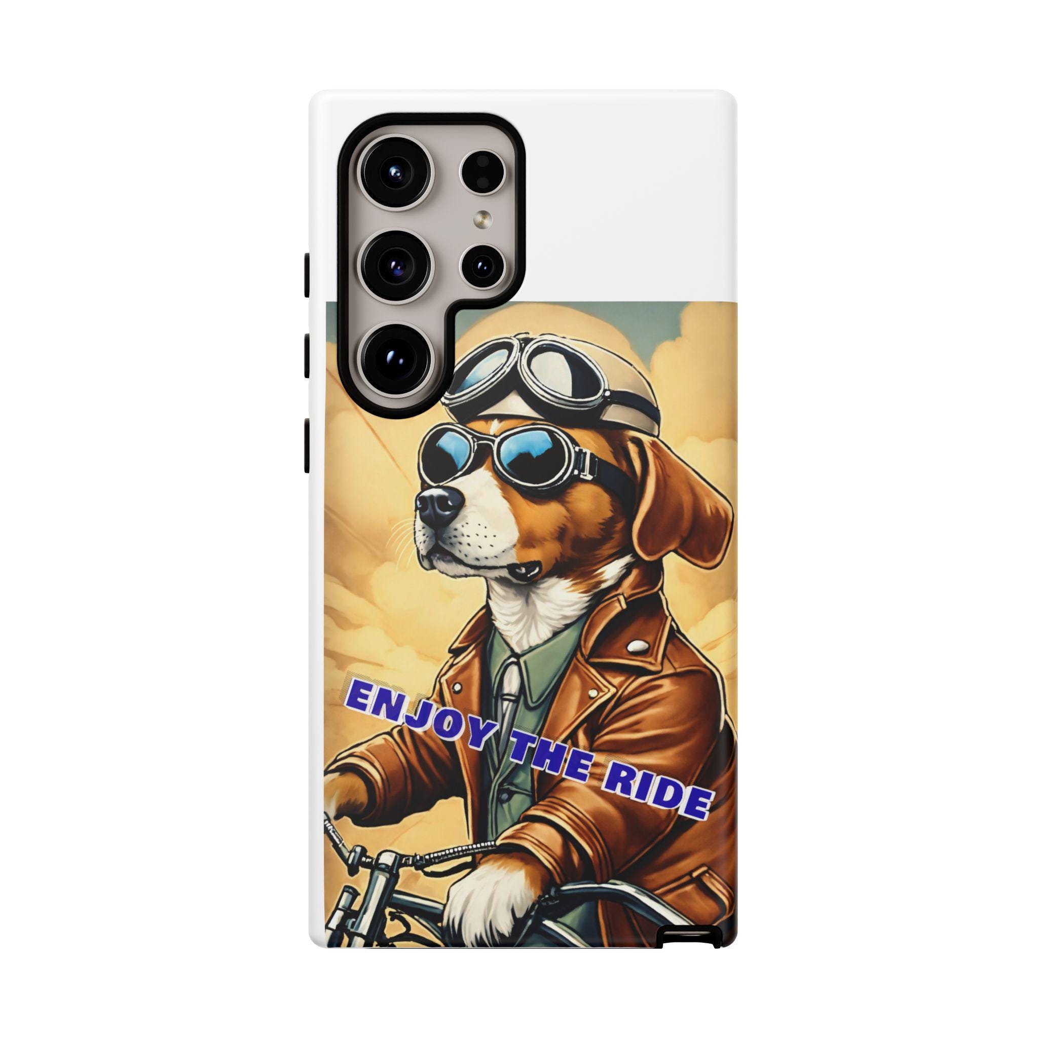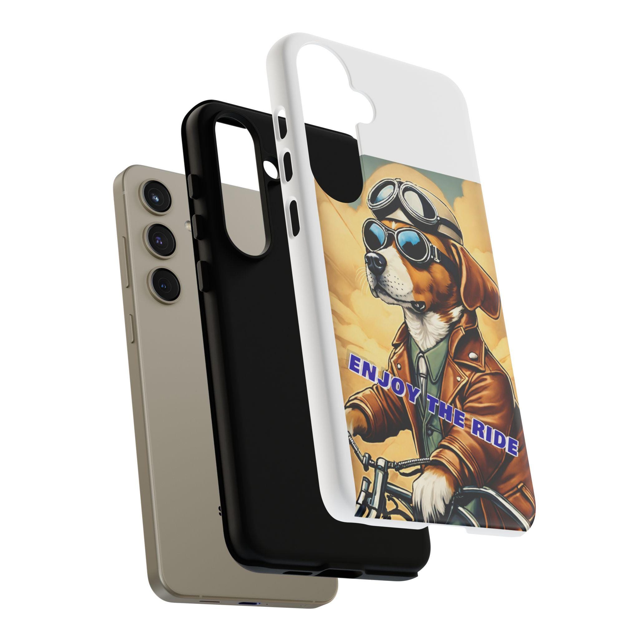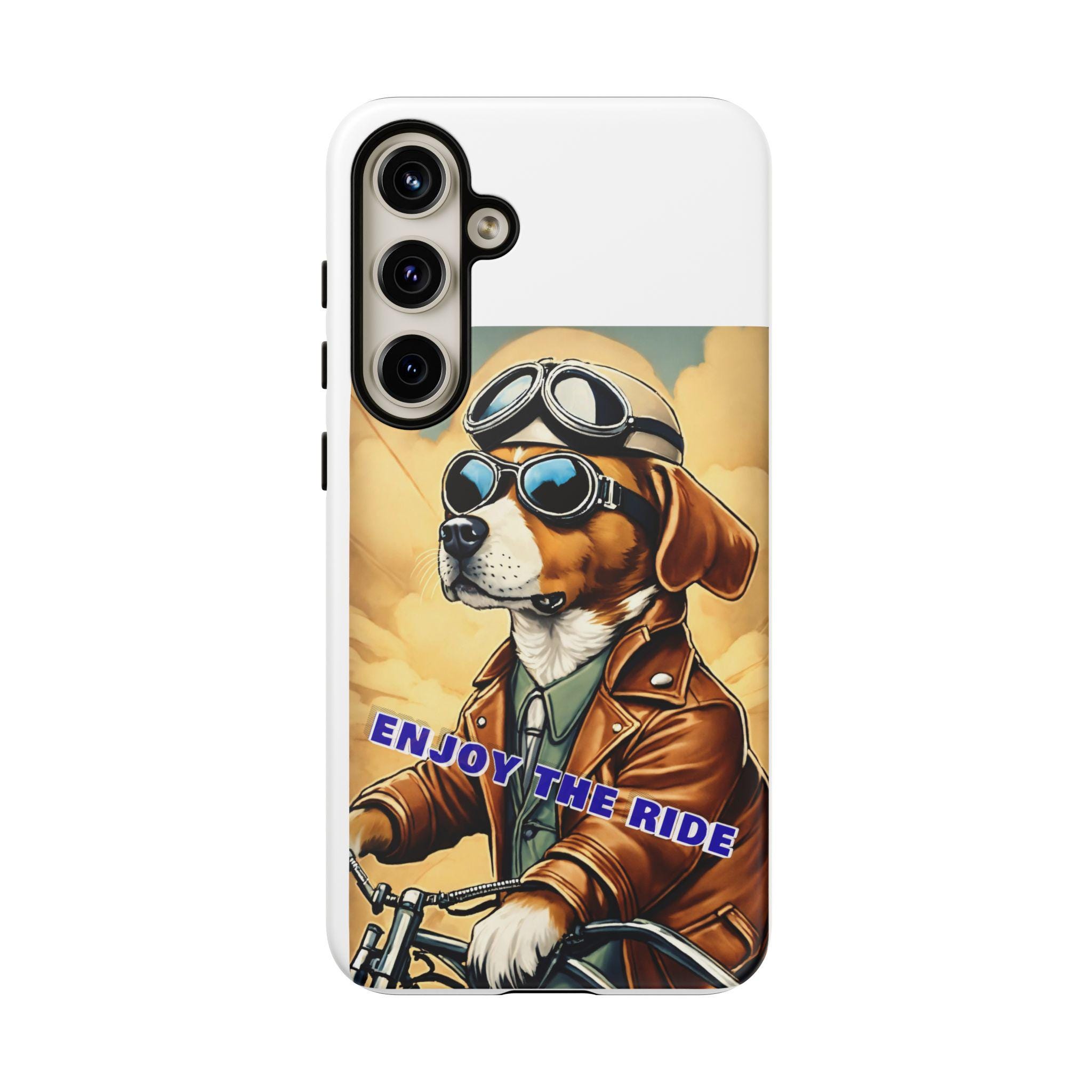 This protective phone case brings playful vintage energy to your daily carry. A retro-styled beagle in aviator goggles and a leather jacket rides toward a golden sky, the slogan “ENJOY THE RIDE” running across the art. The case balances bold, full-wrap color with a slim, dual-layer construction so your phone looks lively while staying protected from drops and daily wear. The glossy or matte finish options keep the image vibrant and weather-resistant, and the precise cutouts preserve full connectivity and wireless charging support. Thoughtful materials and certifications mean durable use without compromising on style.